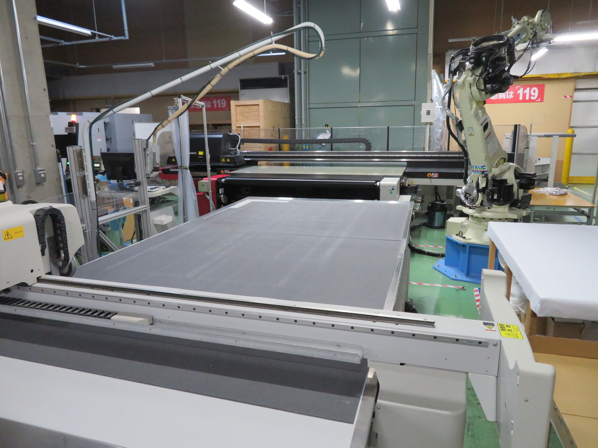 このほか、大判のフラットベッドインクジェットプリンタにパネルを乗せ、プリントが終わったらパネルをカッティングプロッターに移動させるという作業も大型のロボットアームが代替しています。