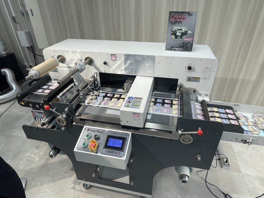 「シール・ラベルゾーン」にはデジタルラベル印刷機の「True Press L350UV」を設置。製版に手を加えず、デジタルコンテンツファクトリーで自動面付けしたラベルを印刷していた。さらにサンワーコーケンのカッティングプロッター「CHERRY BLOSSOM」で抜き加工も実演していた。