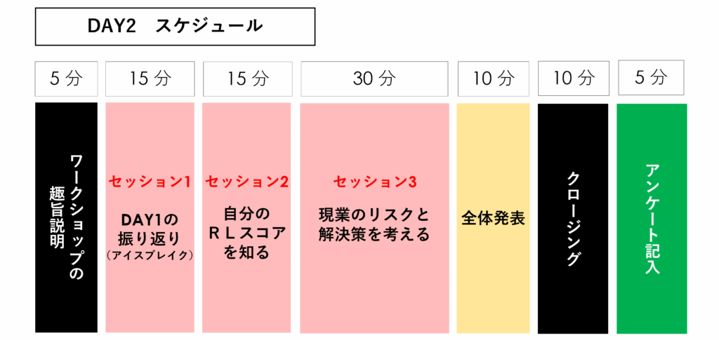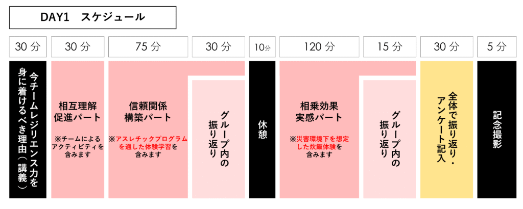 会場は都心からアクセスの良い国立オリンピック記念青少年総合センターで実施する。Day1では、アスレチックプログラムや炊事体験を通じてチームの結束を高め、Day2では独自指標「レジリエントライフスコア」に基づき、各自の特性を可視化しながら職場課題の分析と解決策を検討する。