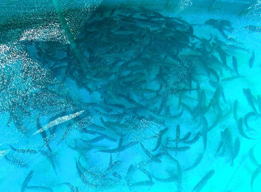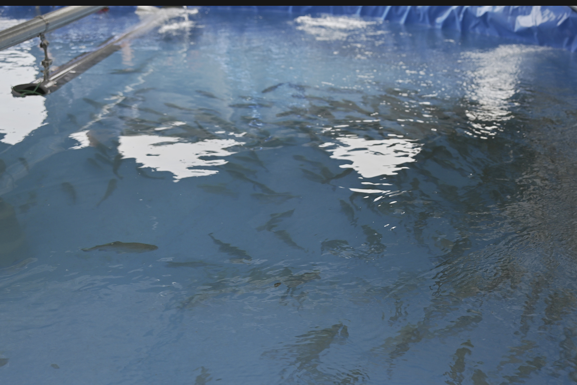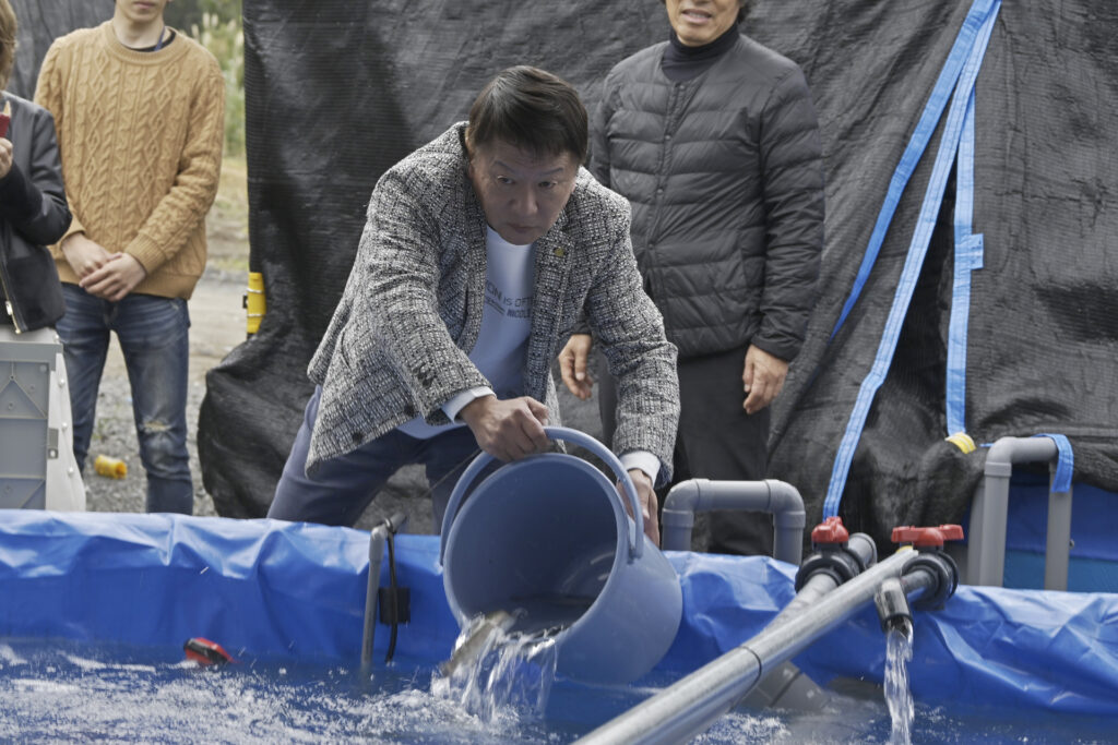完成した設備は、地域の水資源を活用し、陸上環境でサーモンを育成することを目的とした試験用施設である。放流式では、設備の最終確認後、初期群として約1,500匹のサーモンを生け簀へ放流し、育成を開始した。