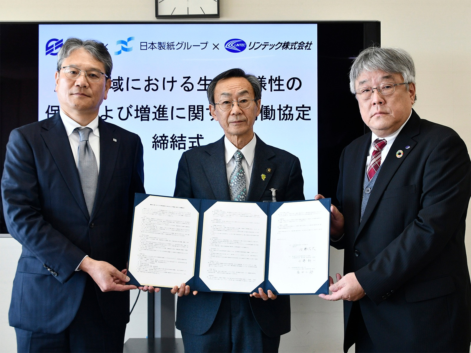 韮崎市役所で行われた締結式には、韮崎市の内藤久夫市長、日本製紙の佐藤耕一執行役員原材料本部長、リンテックの福田二郎環境・安全統括本部長が出席した。また同日、韮崎市は「韮崎市ネイチャーポジティブ宣言」を表明。リンテックもこれに賛同し、今後、協定に基づきネイチャーポジティブの取り組みに積極的に協力するとしている。