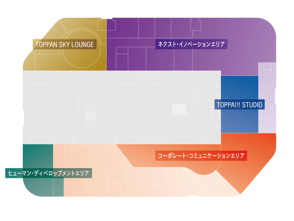 展示エリアは4構成。「企業・事業紹介エリア」ではデジタル年表や5つのコア技術を軸としたソリューションを展示する。「新事業共創エリア」ではワークショップや実証開発を行うプロジェクトルームと実験エリア「SANDBOX」を備える。「人財育成エリア」では研修プログラムや学生向けリクルーティングを実施する。また「TOPPAN SKY LOUNGE」ではVRシアターを備え、歴史・文化・芸術をテーマとしたプレミアムなコンテンツを国内外の顧客に提供する。
