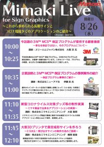 【2020年8月26日】ミマキエンジニアリングは8月26日(水)、オンライン展示会「Mimaki Live for Sign Graphics~これから求められる長期サインとコロナ環境下でのアプリケーションのご紹介~」を開催する。