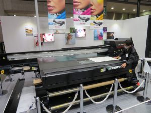 同社では国内初となる大判のフラットベッド機で、最大出力速度がクラス最速級の116m/h。最大出力サイズは2500mm×1300mm、出力厚は110mmと大きく厚手のメディアへプリントできる。