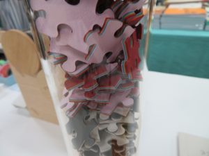 素材をパズル状にした商品をすくう「パズルすくい」は1回300円。これパズルとしては使えないんですが、メモのように一筆書いて手紙に居れたり、プレゼントに添えたり、中にはピアスにしている人もいるそうです。紙の使い道って幅広いですよね。