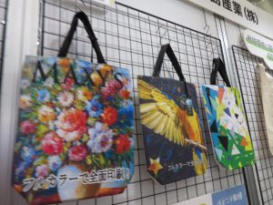 敷島産業の「フルオーダーバッグ」は、インクジェットプリントでフルオーダーの場合は1000個から、規制の形状であれば100個から生産可能。鮮やかなフルカラーで、写真やイラストを使ったデザインも再現できる。
