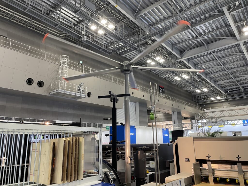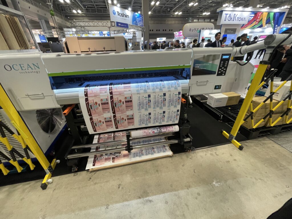 オーシャンテクノロジーは水性インクジェットプリンタやカッティングプロッターのほか、工場用のシーリングファンとミストシャワーを展示。ロボットアームによるスタックを実演するなど自動化や無人化への対応もPRしている。