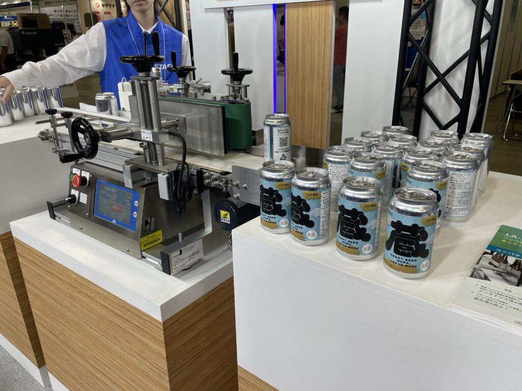 機材ではラベリングマシンをデモンストレーション。缶やラベルに自動ラベリングできる小型のマシンをアピールしている。