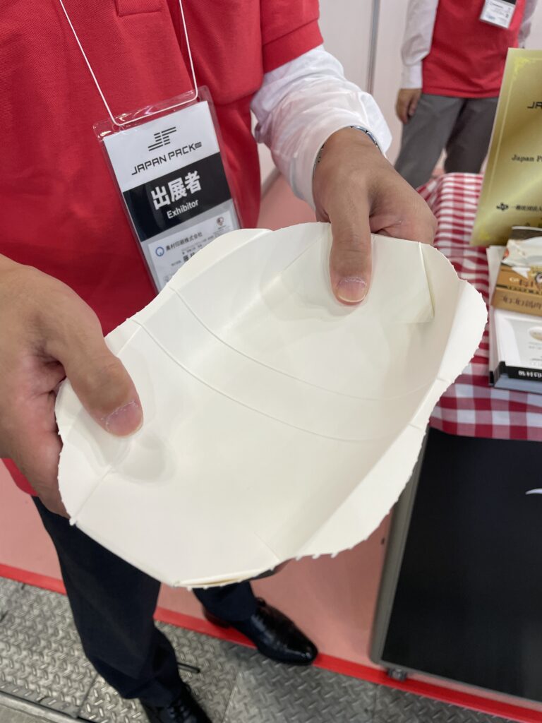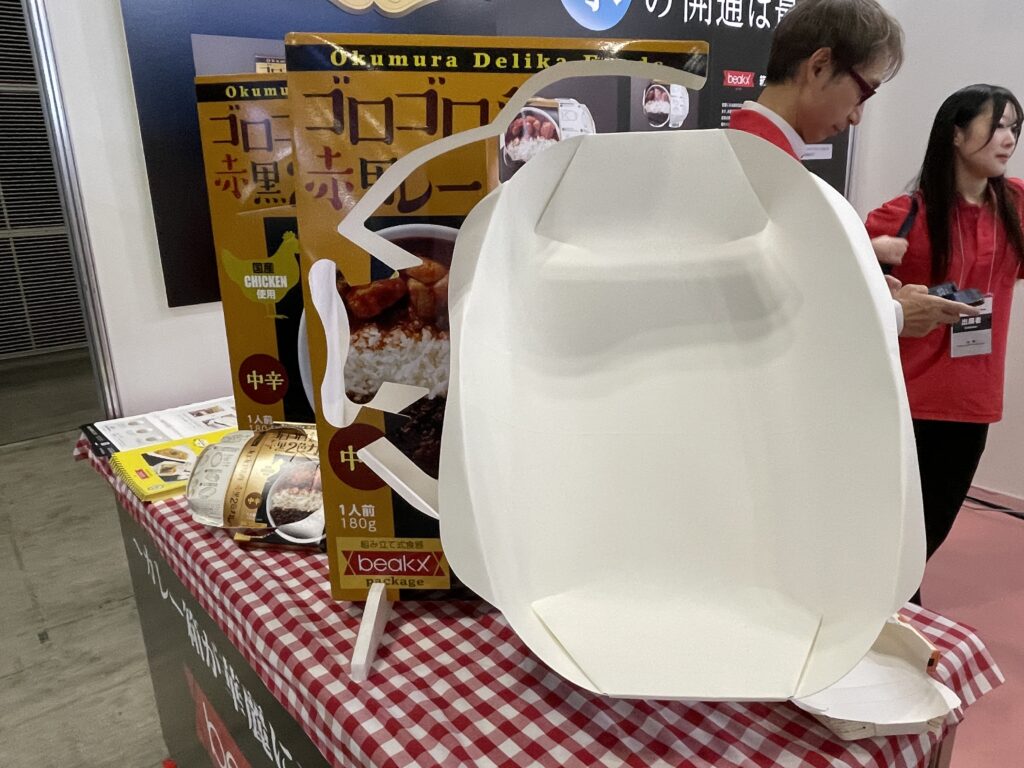 今回の新製品は、商品の箱がそのまま器になるというもので、ブースでは大型のサンプルが展示され、担当者が食器組み立ての実演を行った。
