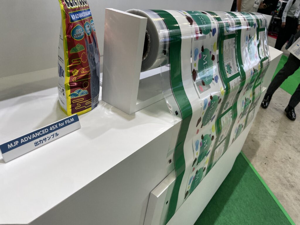 ブース正面には「MJP ADVANCED 45X for FILM」で印刷したサンプルを展示・配布。ブース内のパネルや動画で、印刷機や加工機の活用に関して体系的に説明している。