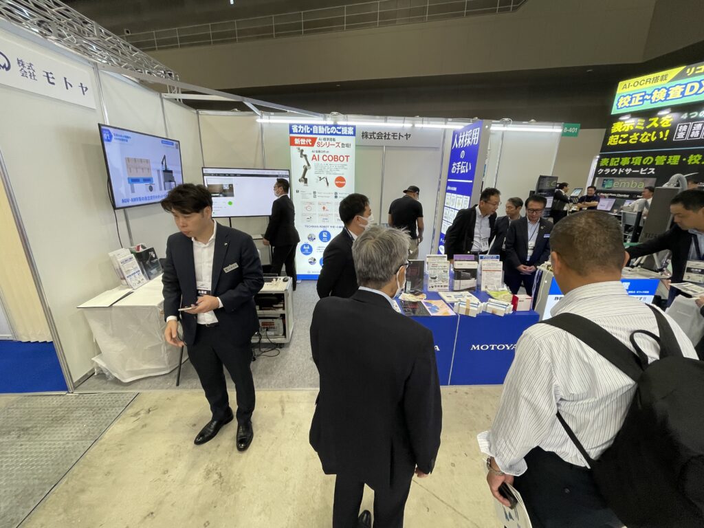 ブースではアクリル製のカードを治具に並べる作業を実演。担当者は「協働ロボという安全柵なしで人と働けるマシンで省人化に貢献する」と話す。