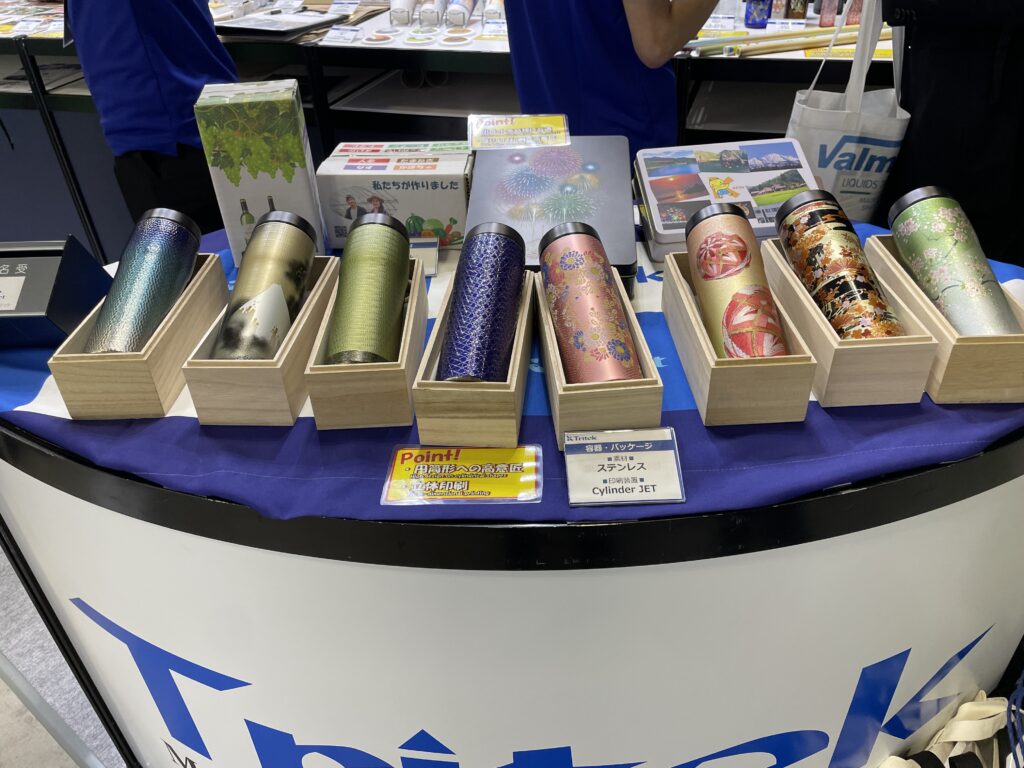 中でもステンレスボトルへのプリントは凹凸などの影響を受けず、メタリックな仕上がりで来場者からは「どこで購入できるのか?」という質問も飛んでいた。