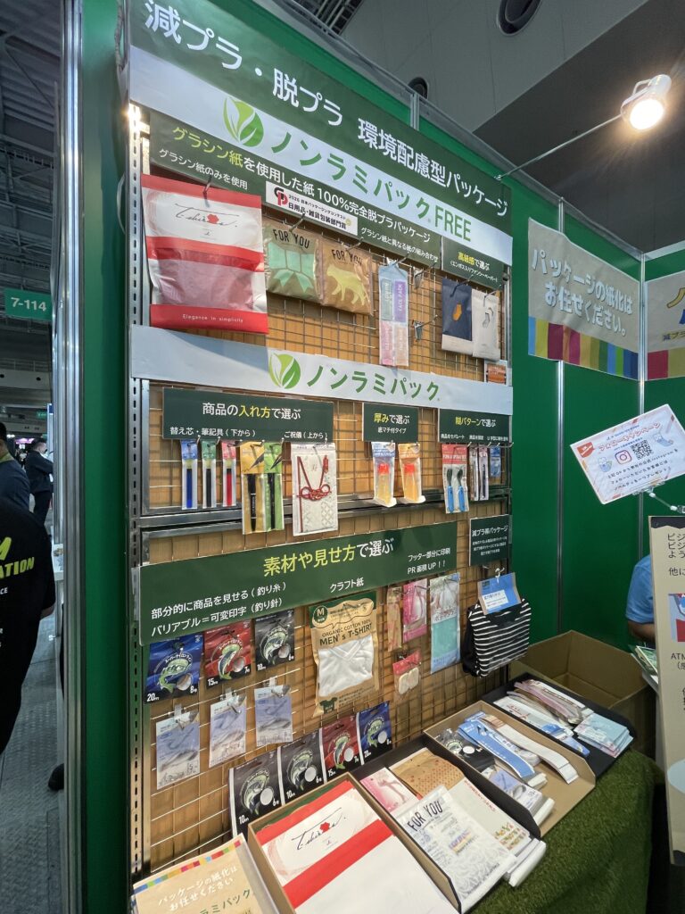 ジェイビーエフサプライの「ノンラミパック」は、同社が2023年に発売した袋製品。ラミネートを使わず、フォーム印刷と加工技術を使用し、紙とOPPを貼り合わせており、プラスチック使用量を削減しコストダウンも実現している。