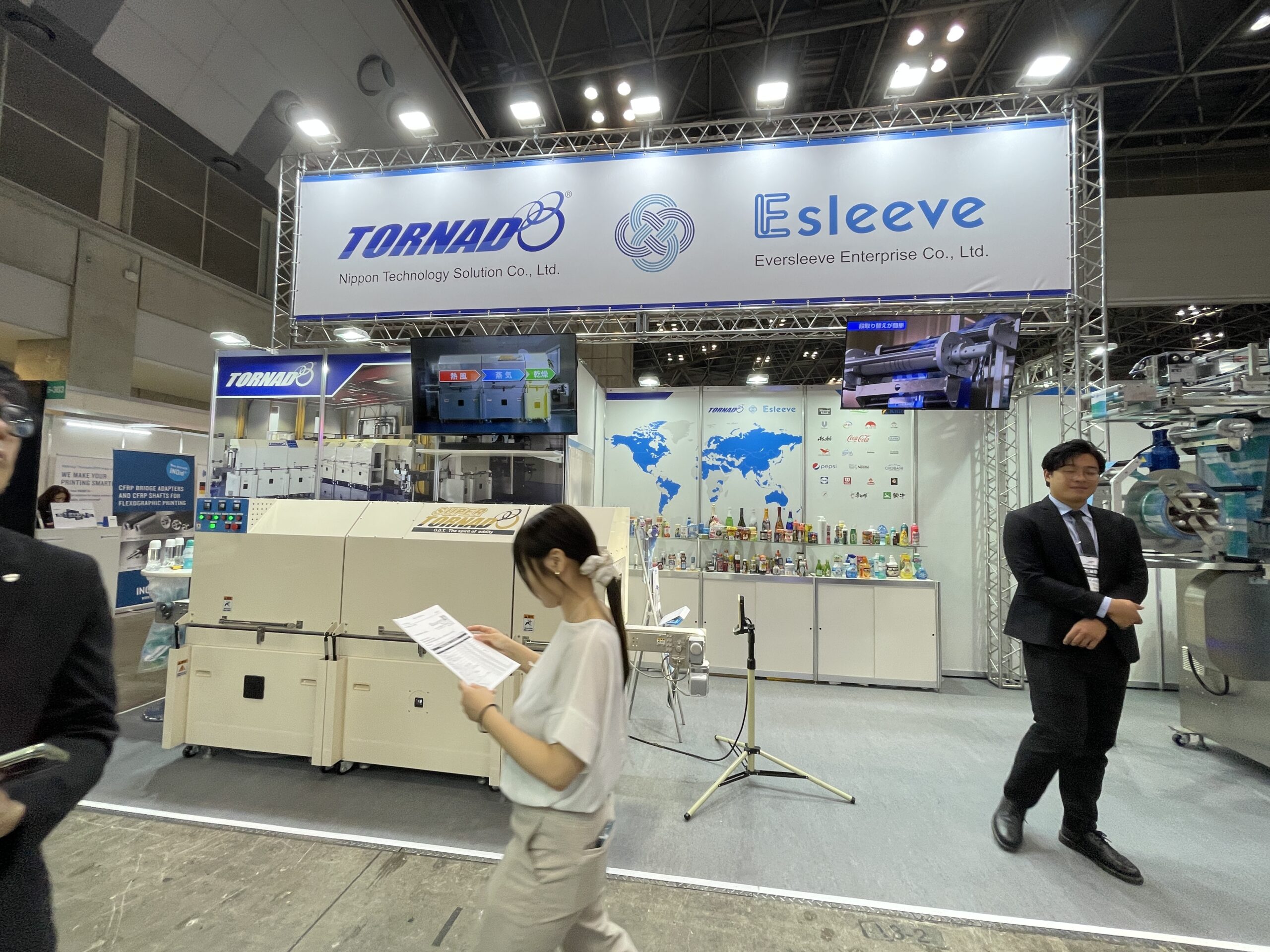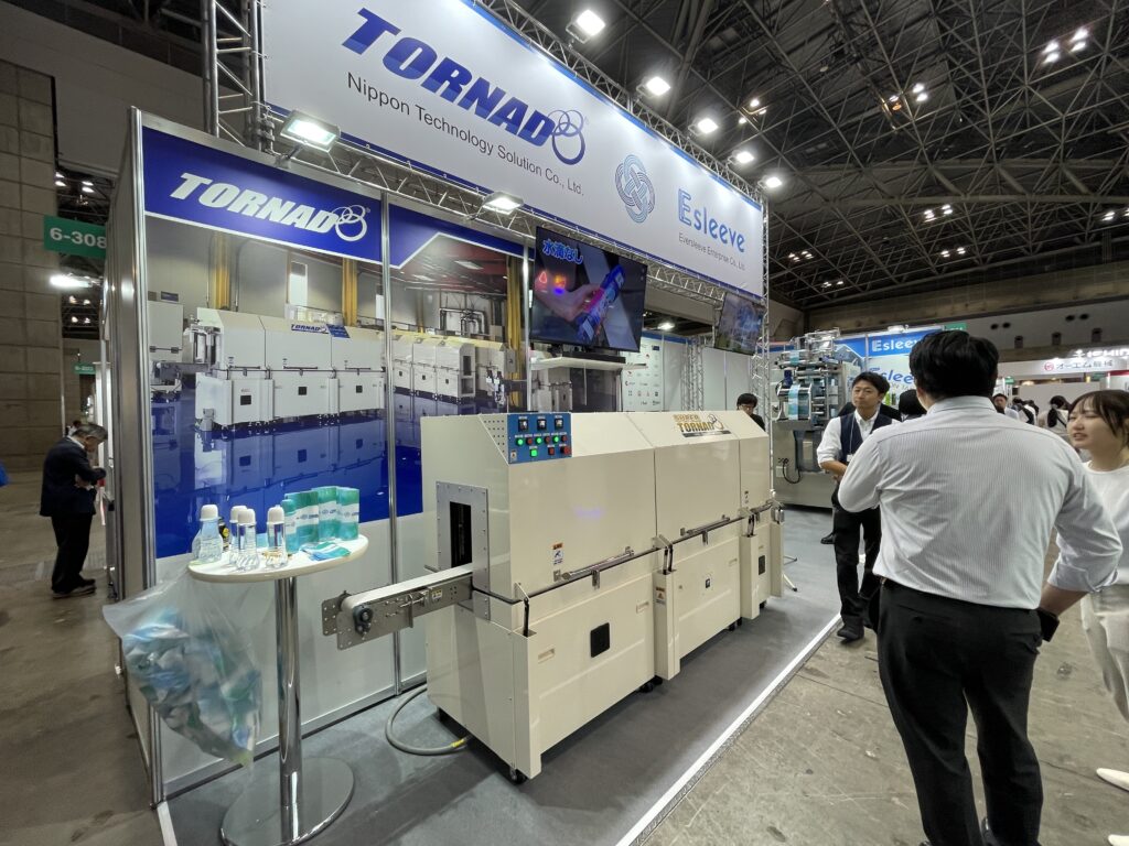 日本テクノロジーソリューションの「Super Tornado(スーパートルネード)」は、PET素材のシュリンク装置。従来機の温風方式に加えて、蒸気混合送風が可能なため、より密着性が高くきれいに装着できるという。