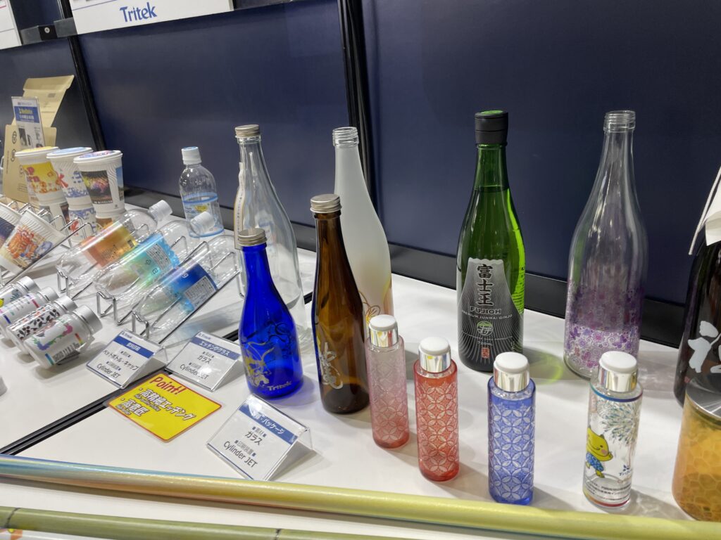 トライテックは、自社のインクジェット印刷機によるさまざまなプリント例をサンプル展示。ステンレスへやガラス、PETなど素材を超えて出力できることをアピールした。