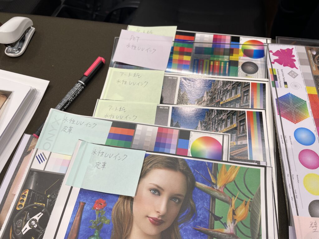 FotunaImatekの「水性UVインク」は、多くのメディアに対応しており、皮革やアート紙などに出力したサンプルを陳列。一般的なUVインクに比べ皮膜が薄く、素材の風合いを生かしたプリントが可能という。