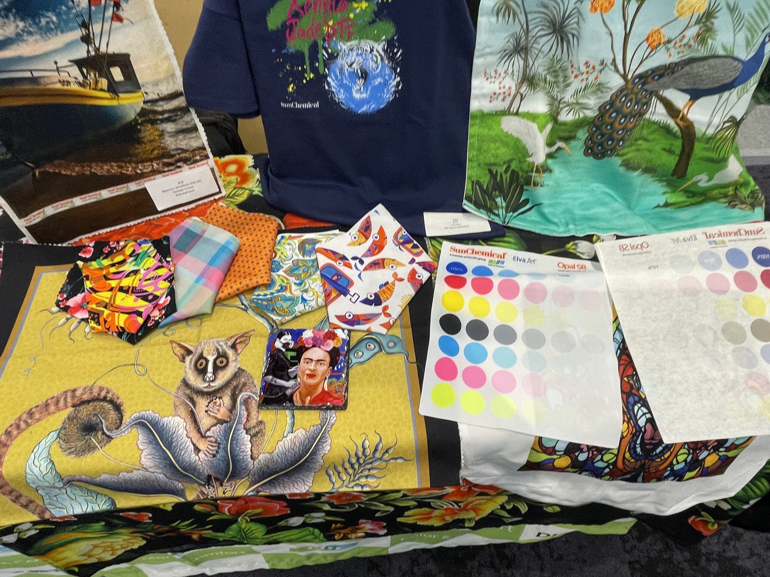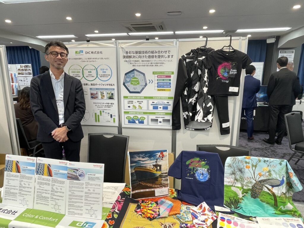 DICはサンケミカルと共同開発したテキスタイル用インクを展示している。布地などへプリントしたサンプルを陳列し、インクの特性を解説している。特に顔料インクを得意としており「リアクティブや酸性がいまだに中心だが、顔料も昨今、導入され始めている」と担当者。
