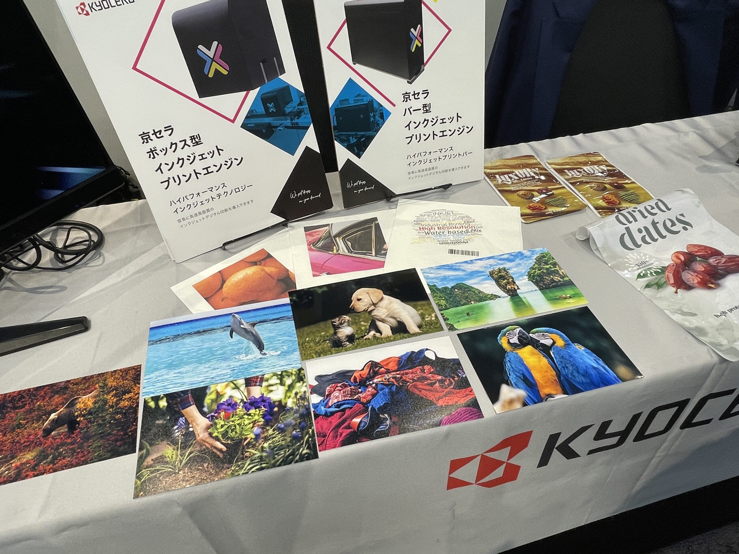 京セラは、最新のヘッドを展示。バー型とボックス型があり、ボックス型はYMCKがすべてあり1つでカラープリントが可能。バー型はスタガは配列で高速用、軟包装などの量の多い出力物に向いている。