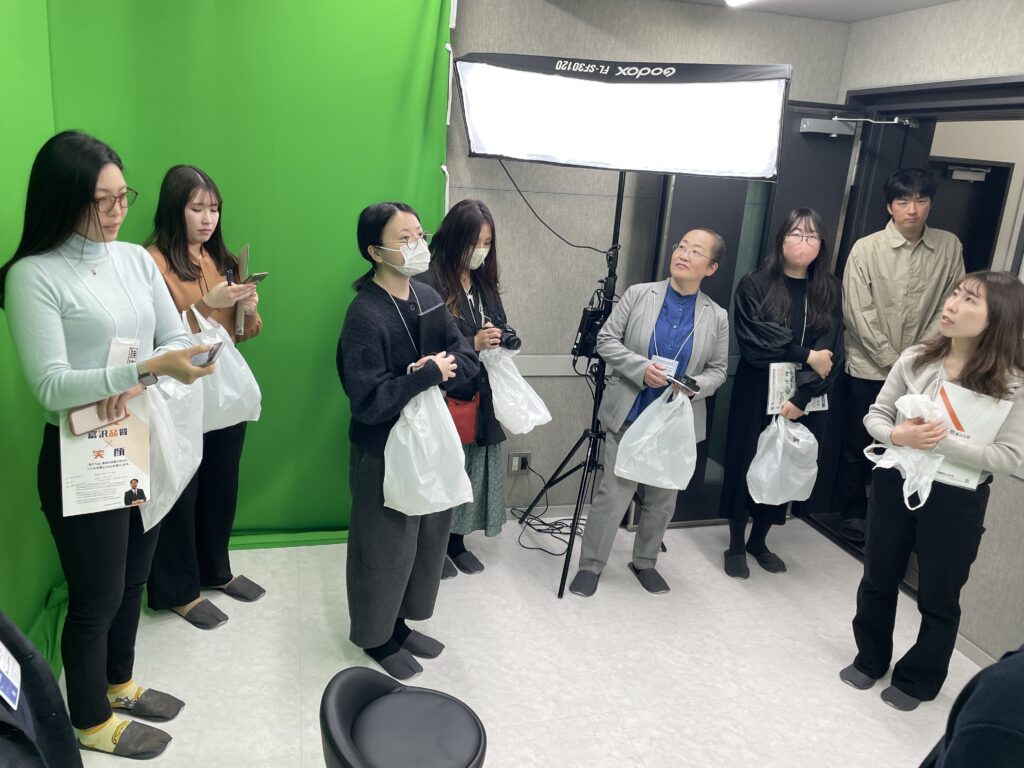 工場ではオフセット印刷機や加工機などを見学し、製作物の用途や部数などについて現場の社員から話を聞いた。また、映像用のスタジオではグリーンバックのセットなど本格的な設備を導入した同社の新事業について説明を聞いた。