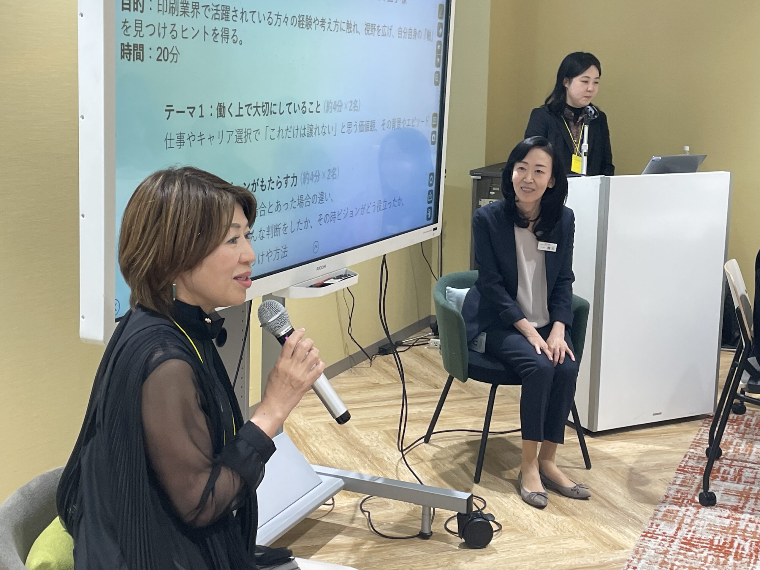 まず、同社のショールーム「プリンティングイノベーションセンター」を見学。その後同社小林加奈氏が司会となりトークセッションをや参加者同士が仕事やキャリアについて意見を交わす交流セッションを行った。