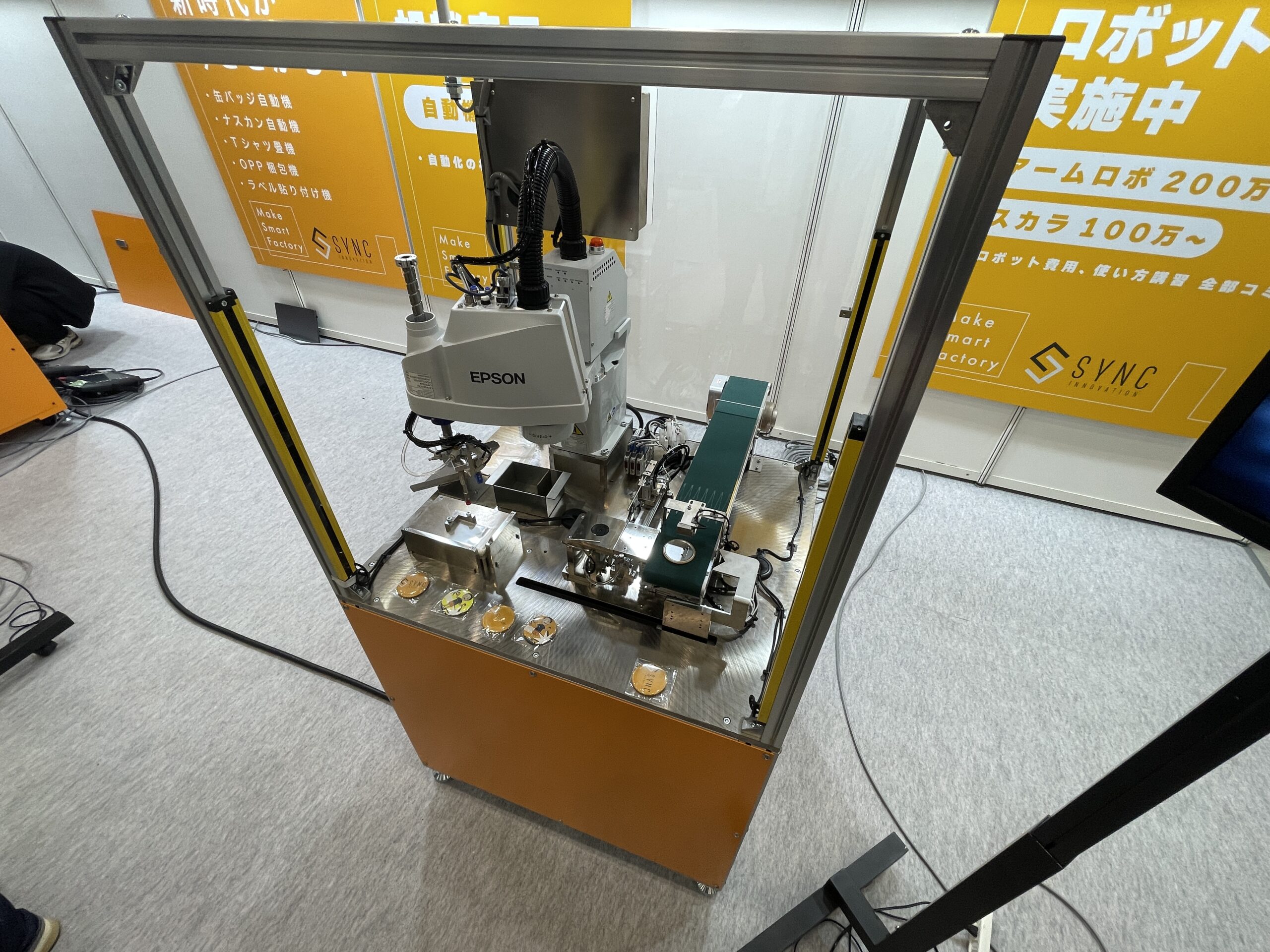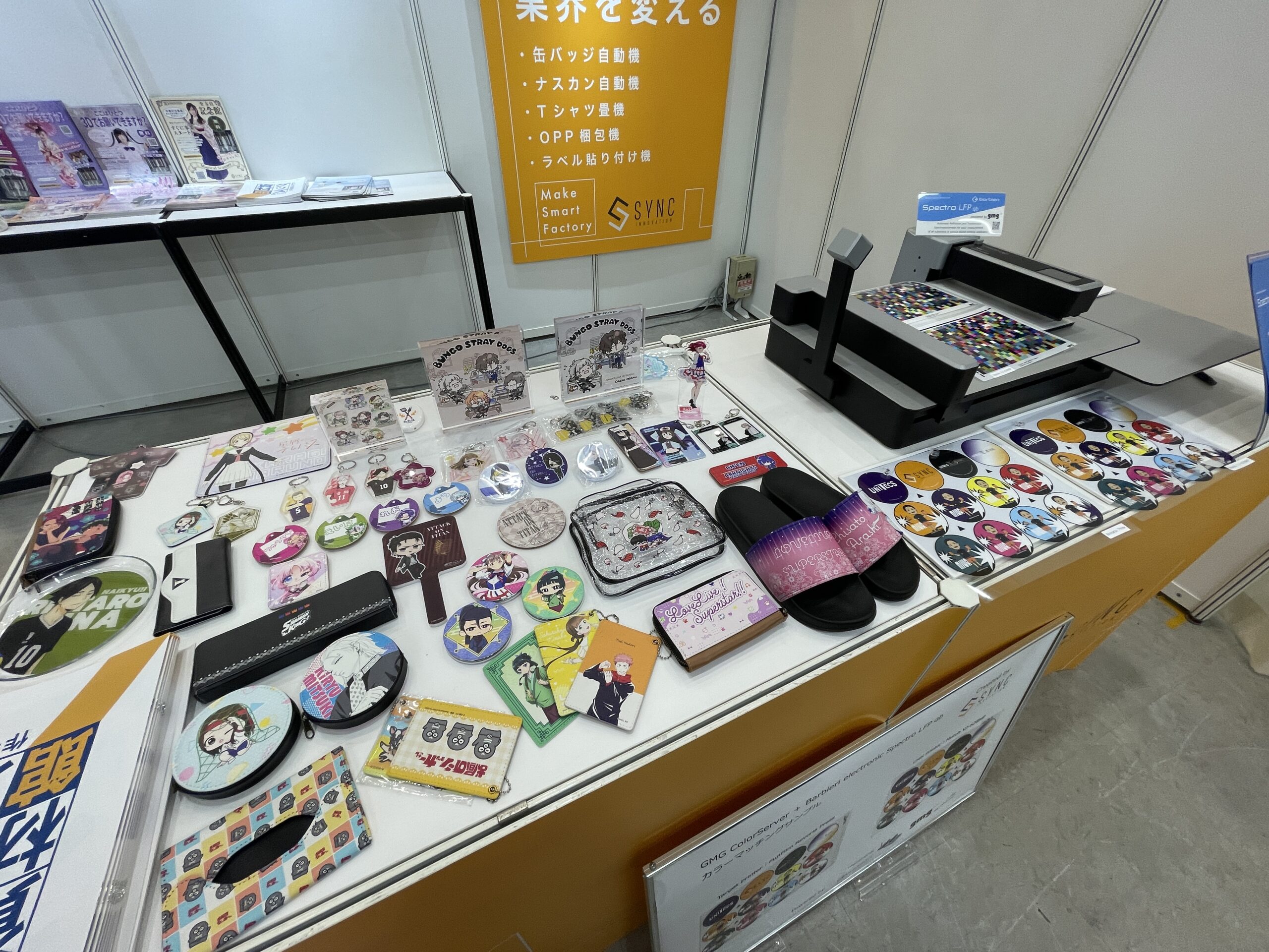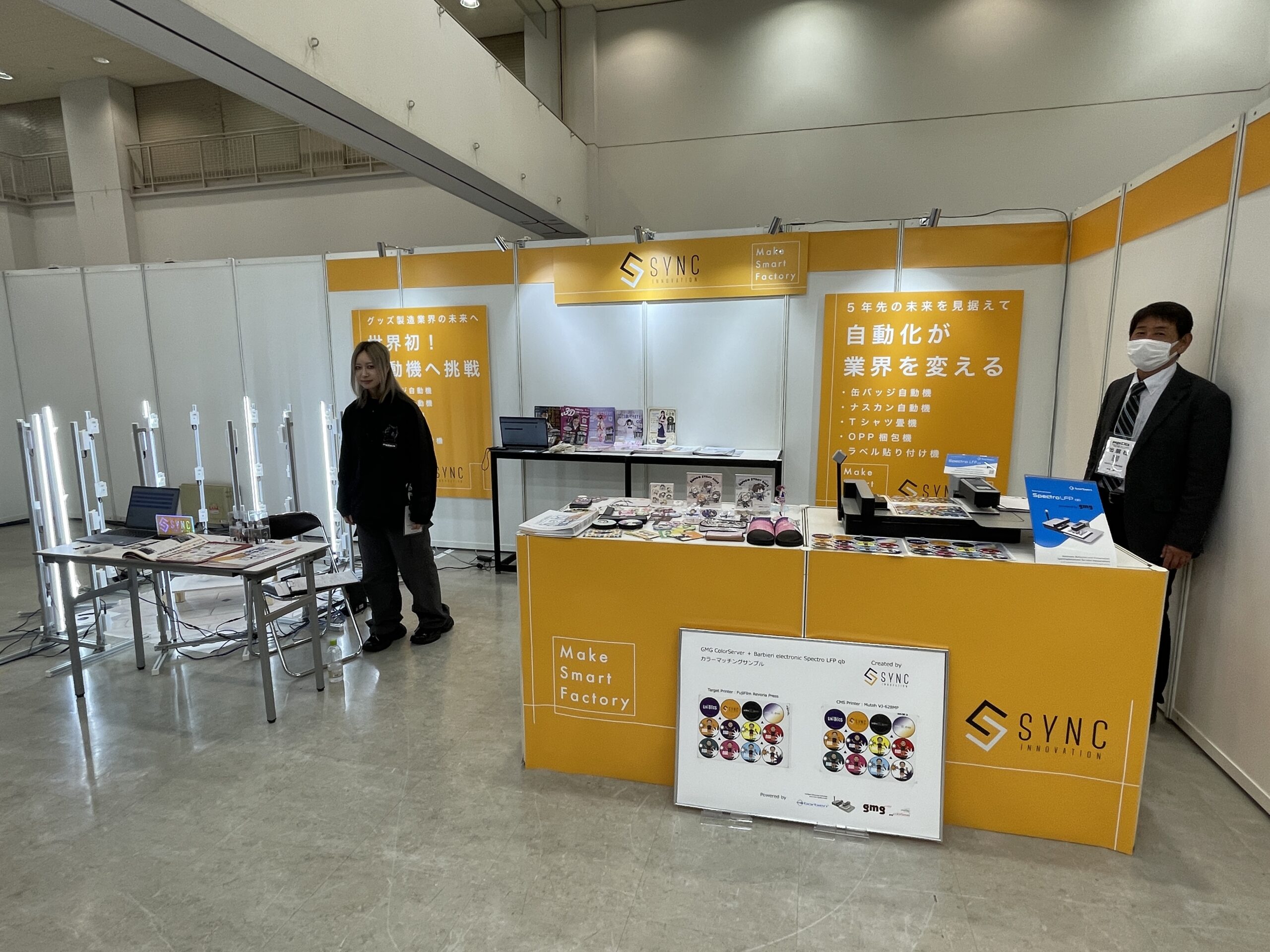 自動化機器コーナーでは、「簡易缶バッジ自動機」を展示。従来は手作業や半自動で行われていた缶バッジ製造を自動化するもので、1時間当たり約350個の生産が可能。完全自動機では同3500個の処理能力を想定している。