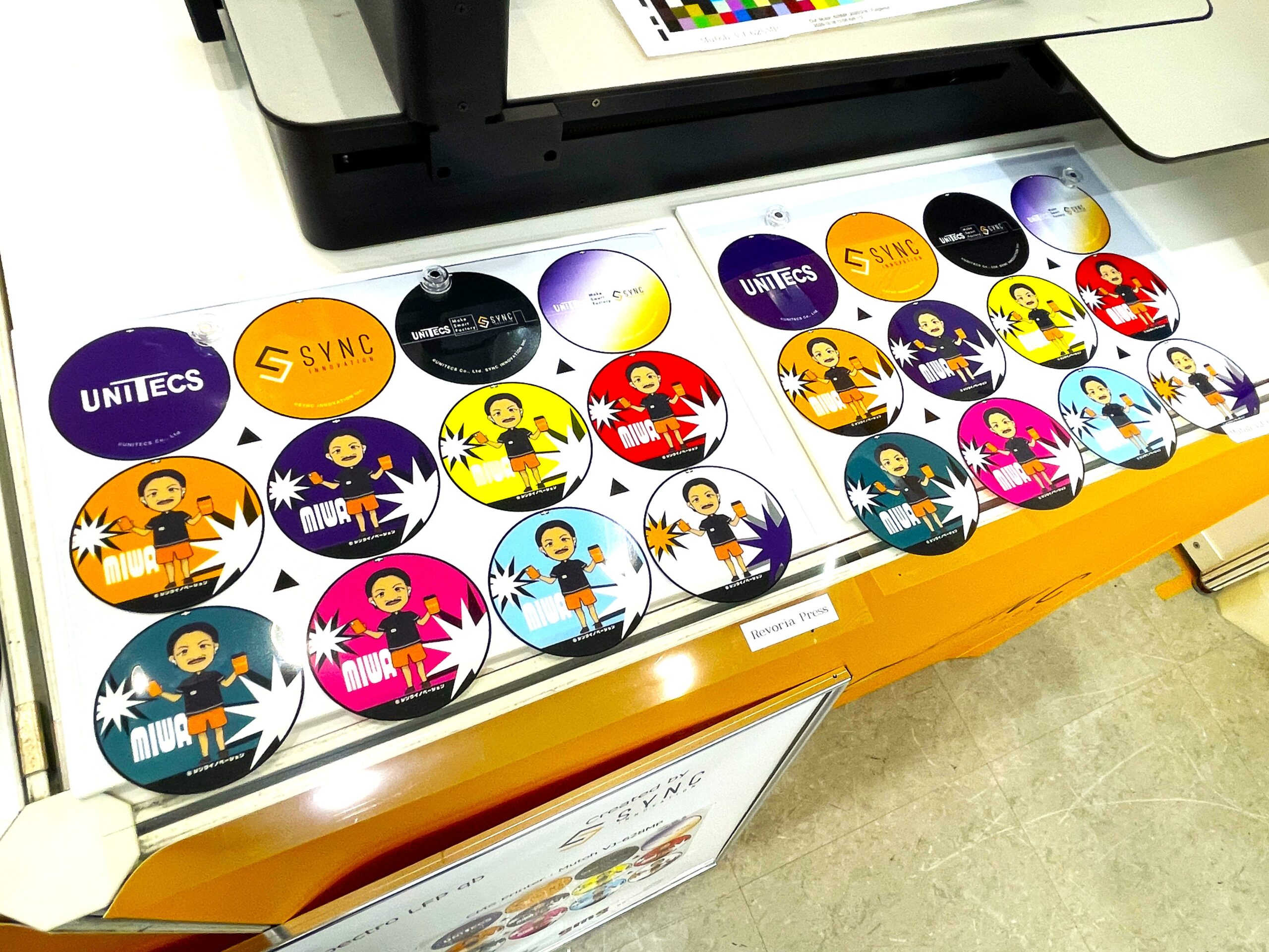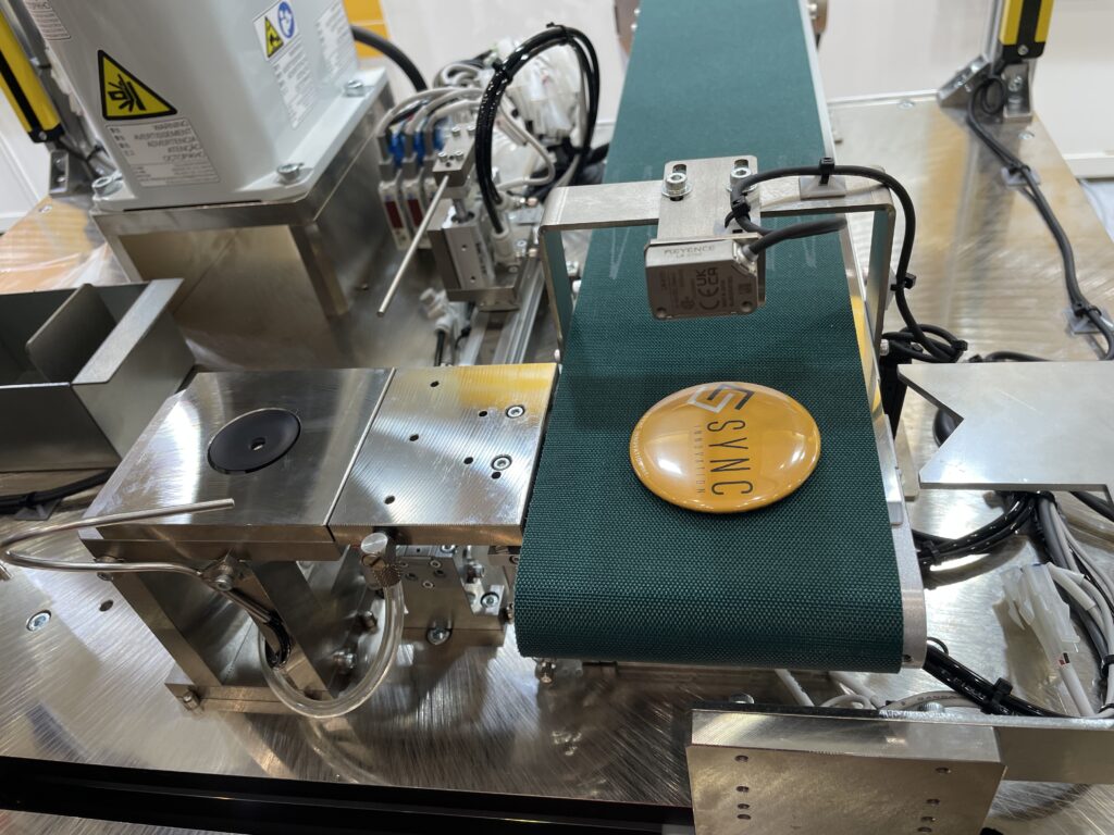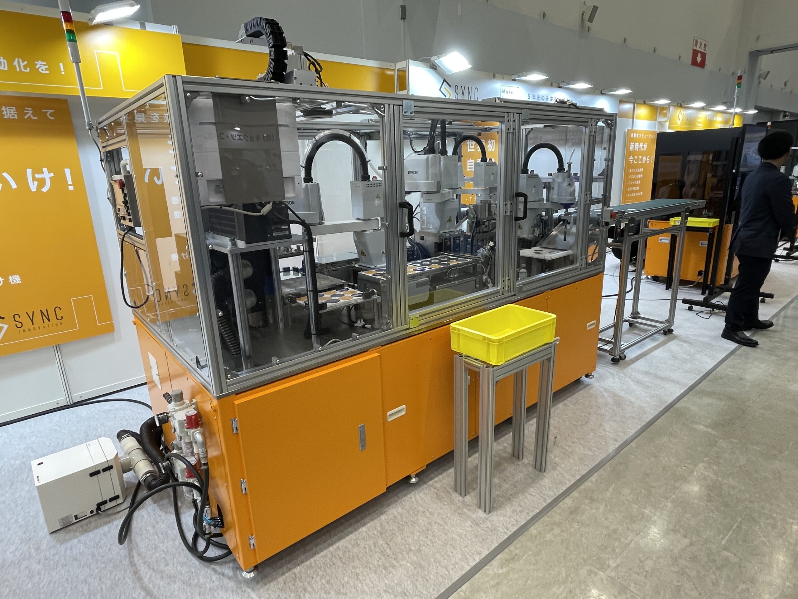 自動化機器コーナーでは、「簡易缶バッジ自動機」を展示。従来は手作業や半自動で行われていた缶バッジ製造を自動化するもので、1時間当たり約350個の生産が可能。完全自動機では同3500個の処理能力を想定している。