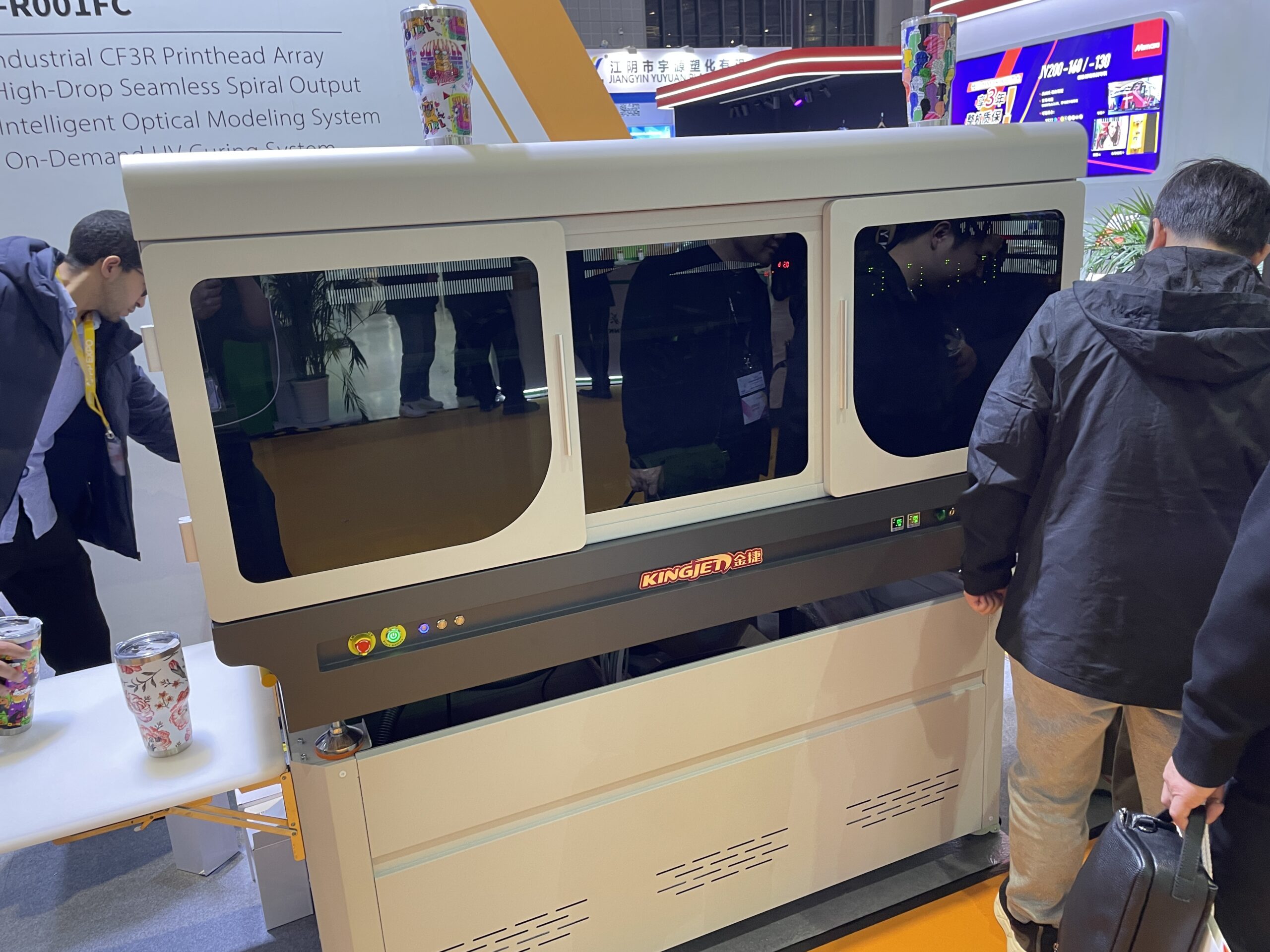 カッププリンタ「KJ-R001FC 」は、タンブラー・ボトルへの360度直接出力に特化した新製品で東芝の「CF3」ヘッドを採用し、高ドロップ(急な曲面・凹凸)や円錐・不規則形状にも対応した。価格は約26,000 ドル。公式サイトやSNSには、展示会などで新製品をデモする動画が急増中。