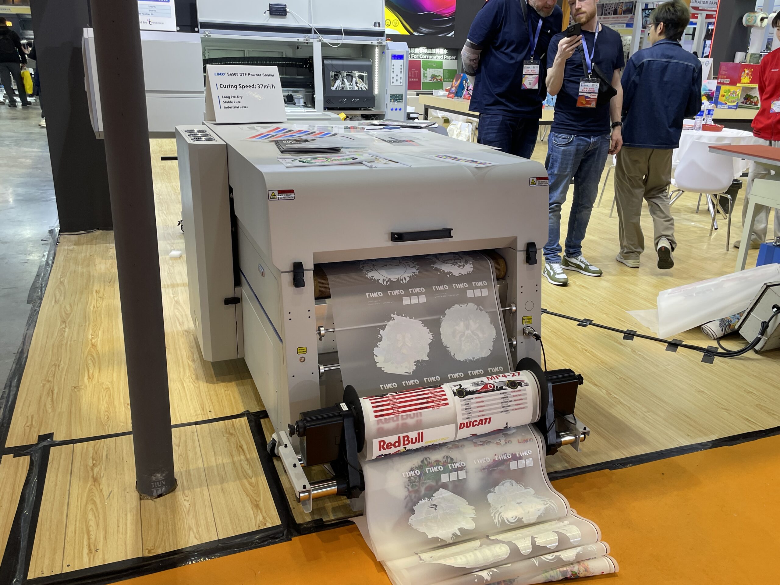 博美機(Trendvision)の「Trendvision S6505」は、60cm幅クラスのDTFプリンタ。A2超サイズでドラフトモード15〜30㎡/h、Tシャツやパーカー、バッグなどアパレルの中量生産に向いている。5ヘッドで約5〜9万元、フルセット(シェイカー + オーブン込み)で約10〜18万元。 迈伺特はDTFシステムの「MEST」を展示。4パスで38㎡/h。