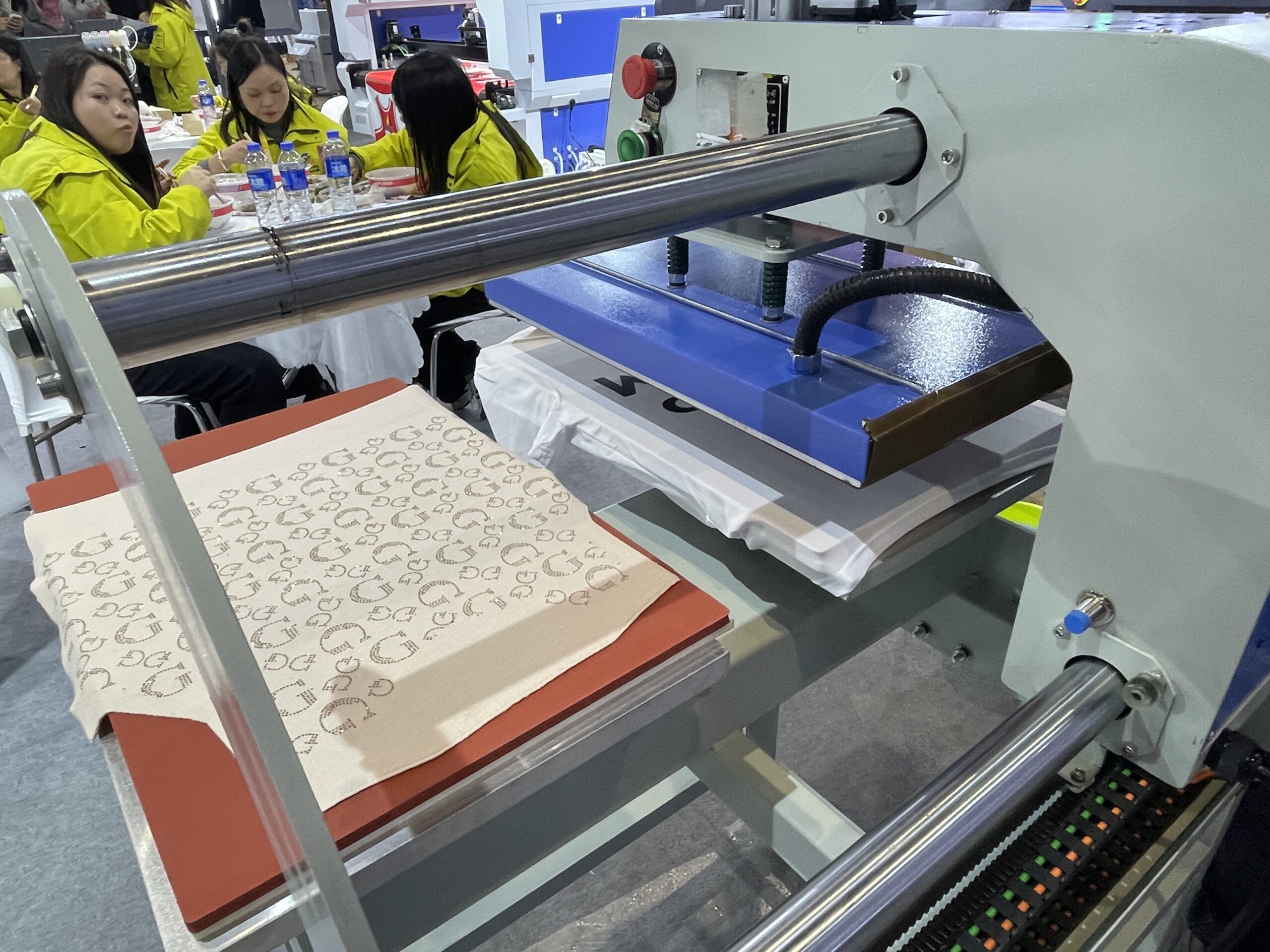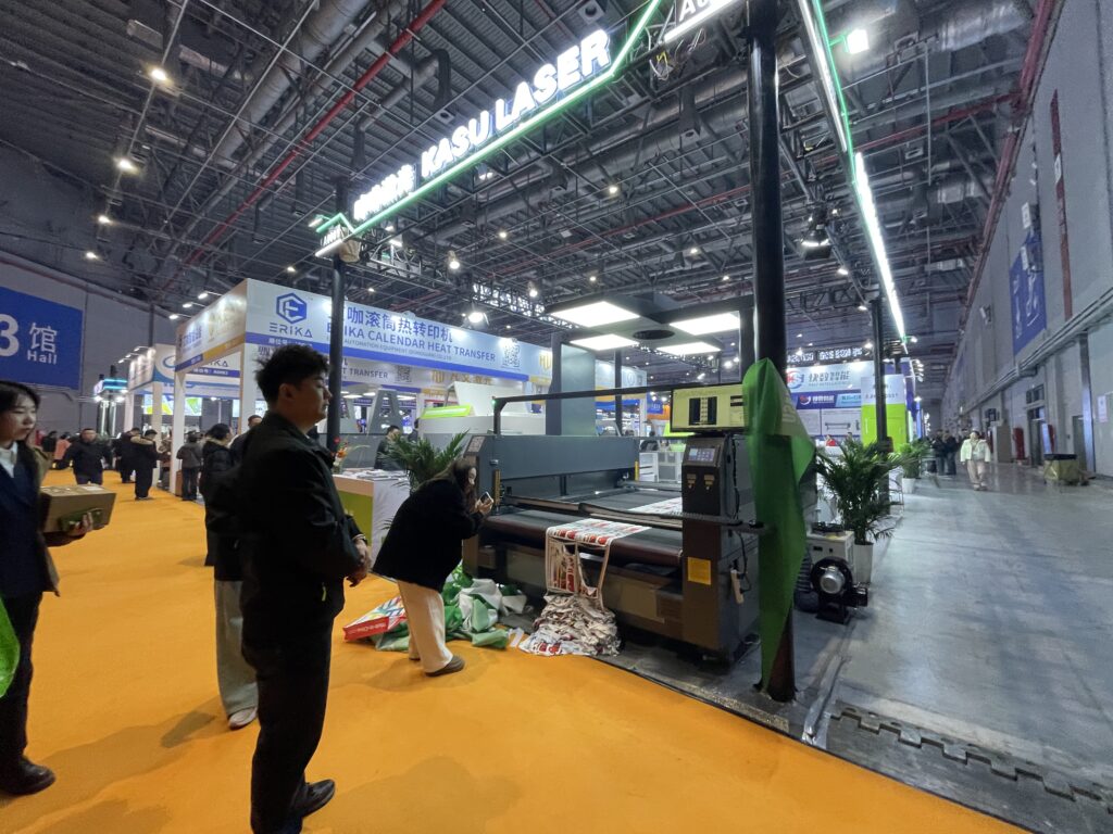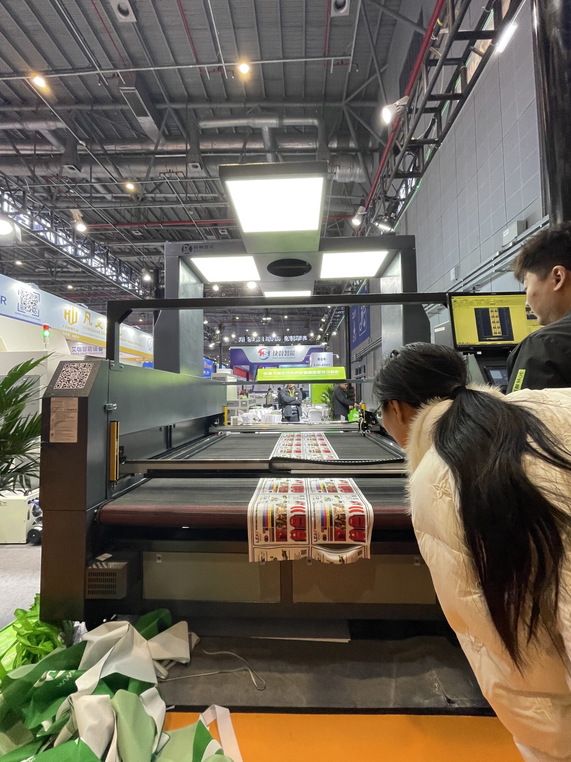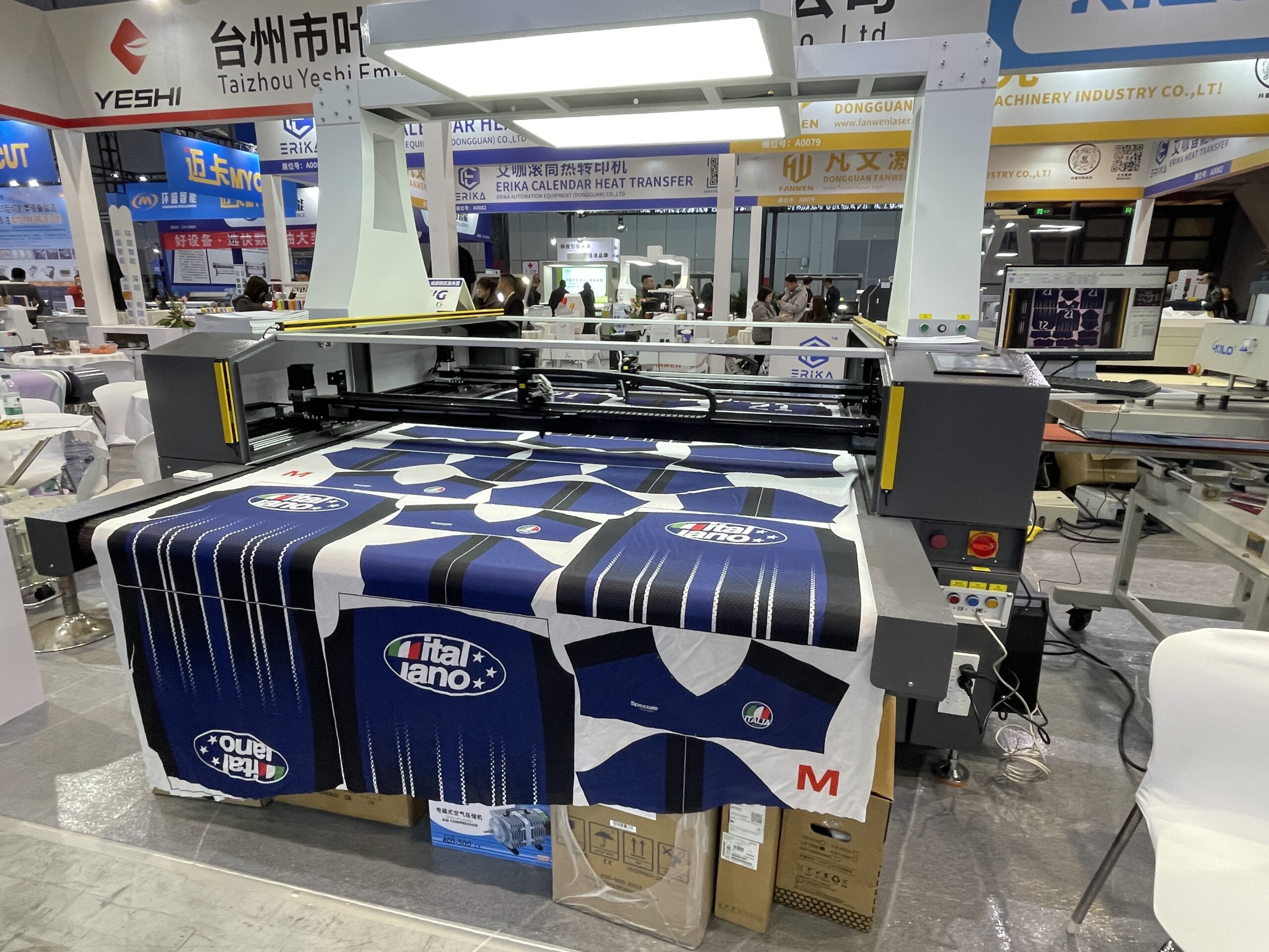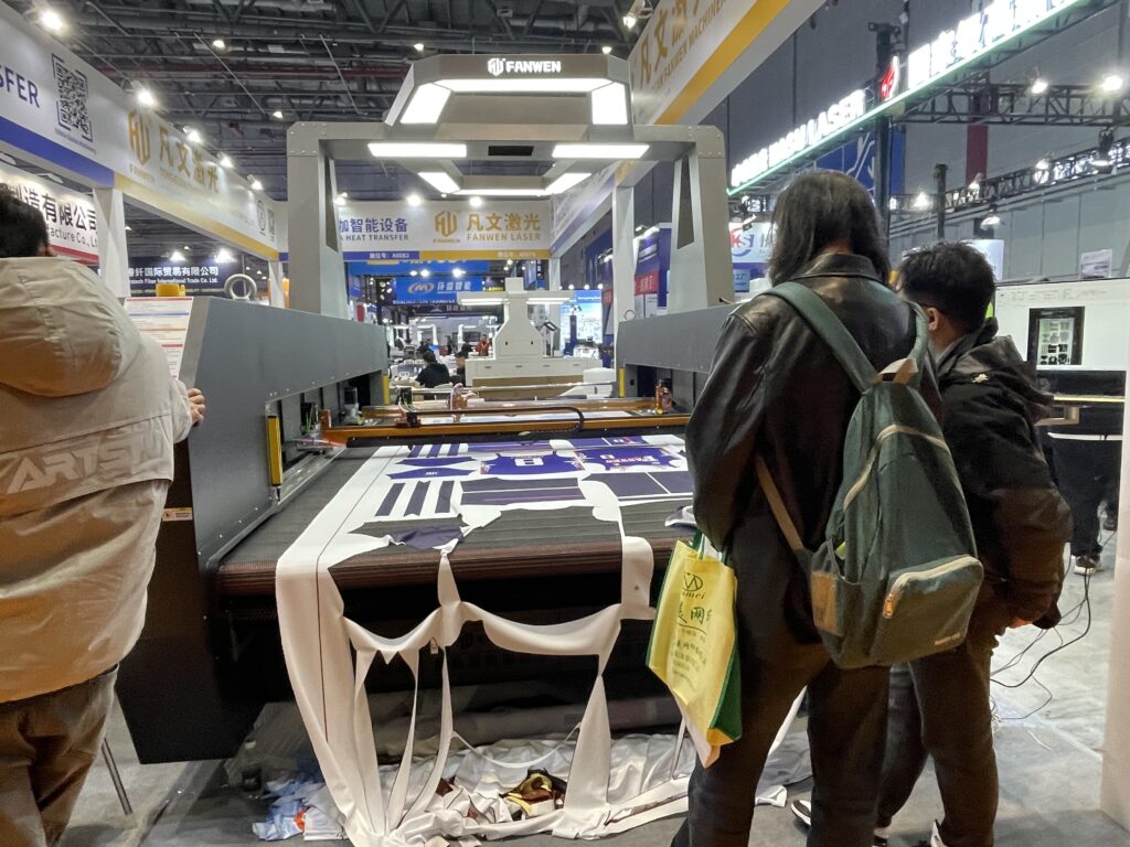 艾咖智能設備(ERIKA)は、広東省東莞の熱転写・デジタルプリント機器のメーカーで2024年4月に設立された比較的新しい会社。「FANWEN」は布地向け高速ビジョンCO2レーザー切割機シリーズでカメラ付き、プリント素材の自動精密カットに適している。今回はサッカーのユニホームとDTFでプリントしたフィルムをカットしていた。