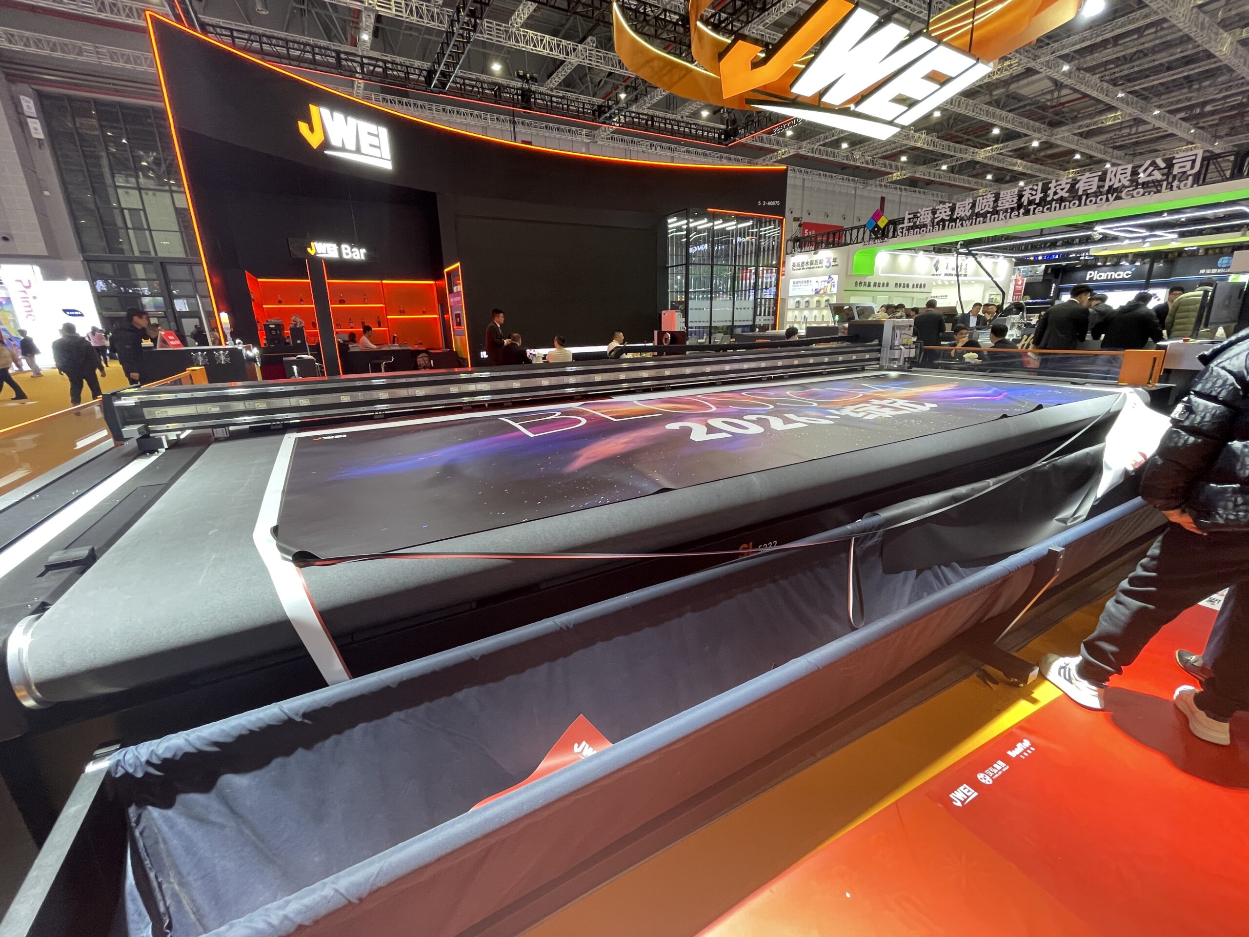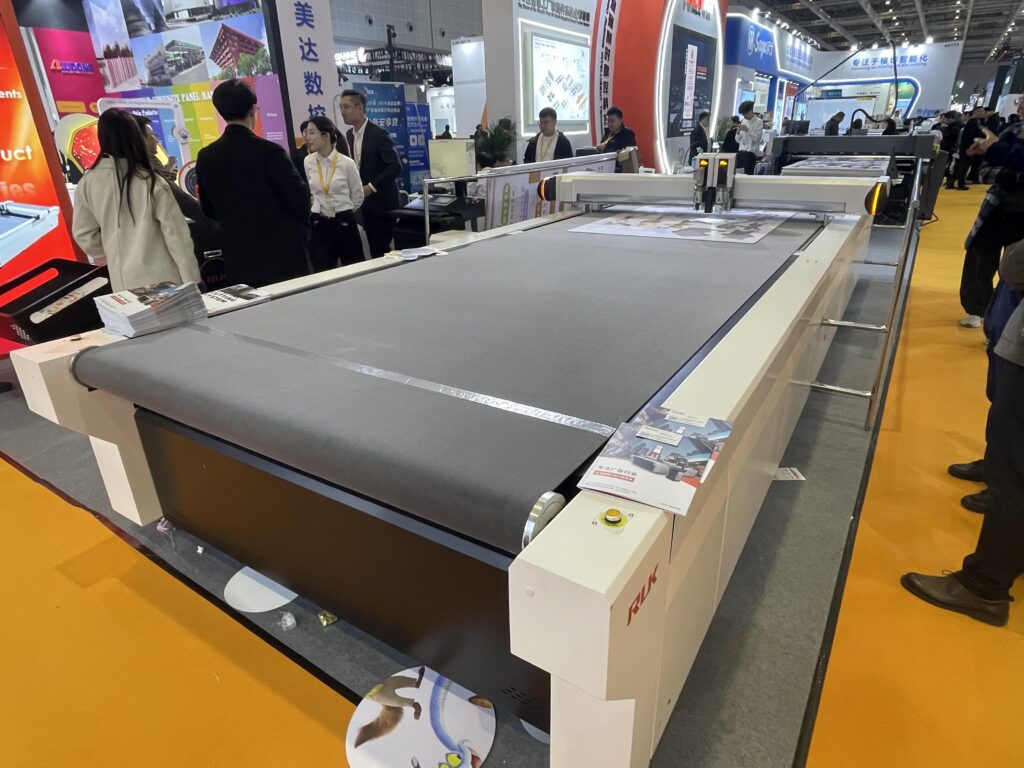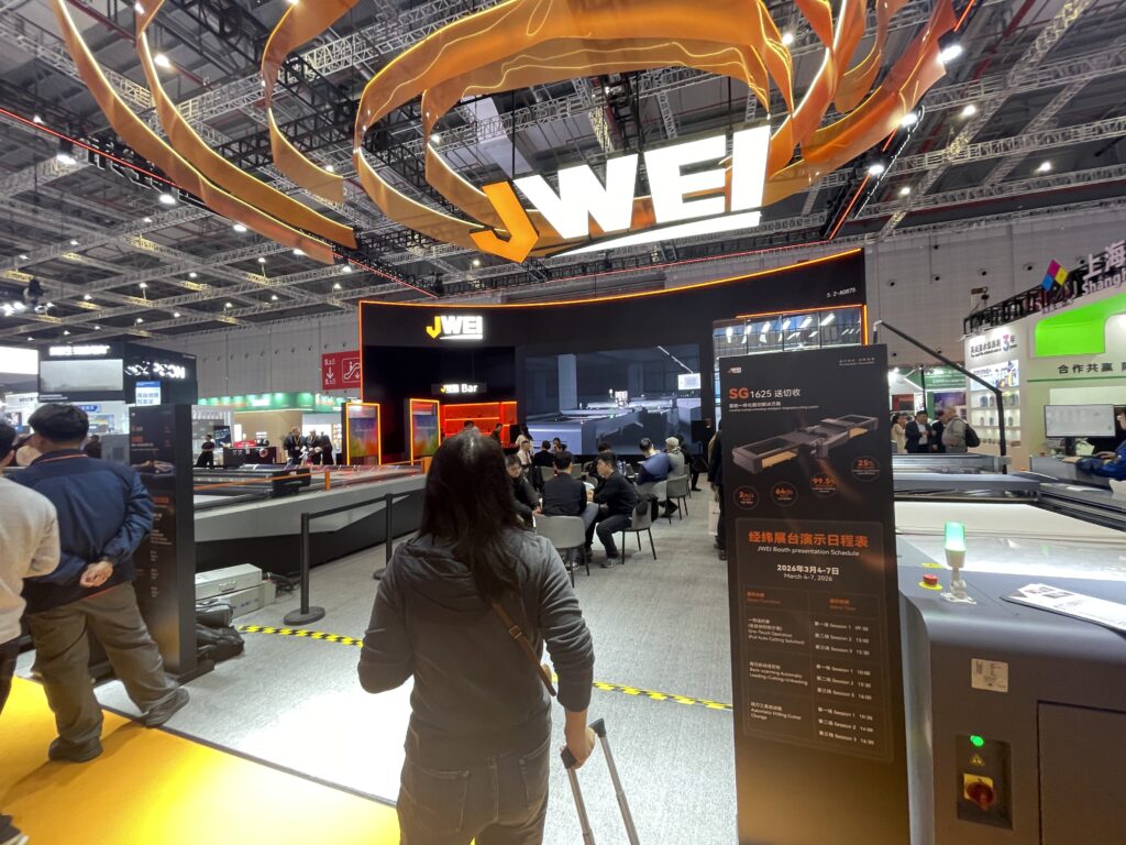 今回最大級の製品を展示したのがJWEI(杭州)。「SL5232」は今年リリースの超大型フラットベッドカッティングプロッタのフラッグシップモデルで、5.2m✕3.2mの超巨大加工エリアを実現した。SLシリーズの最上位機種で「SL3232」(3.2m×3.2m)のスケールアップ版として発売された。価格は3500万円。