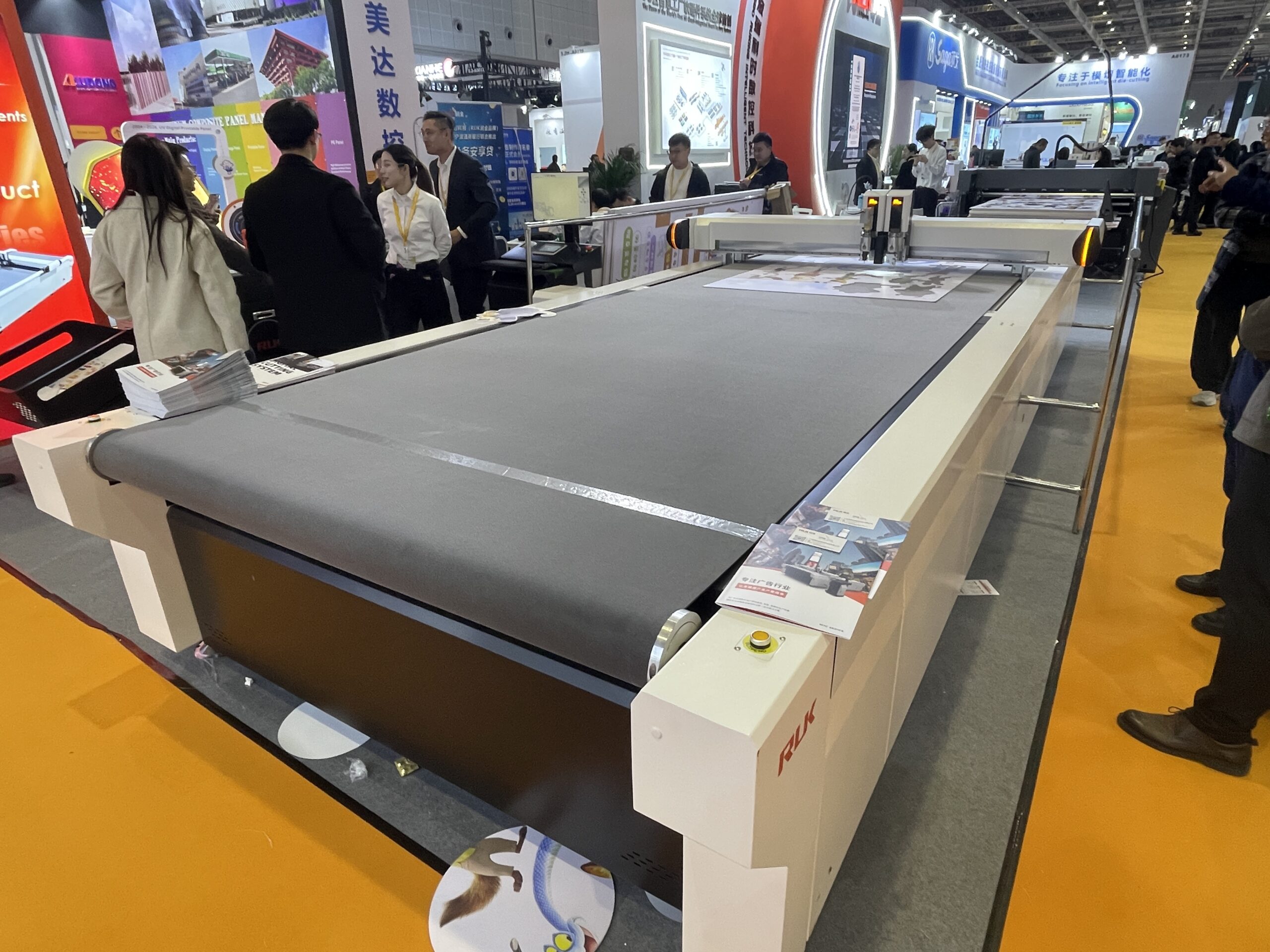 潤金(RUK)のカッティングプロッタ「F1-2516S」は、振動刀搭載で、作業エリア2.5m × 1.6m。最大切断速度3000㎜/s、価格は2万5,500ドル。「MTC06」はフィーダーがついた自動半タイプで3万2,000ドル。 同社では、米国や欧州、中東なども含む地域へ1000台以上販売している。