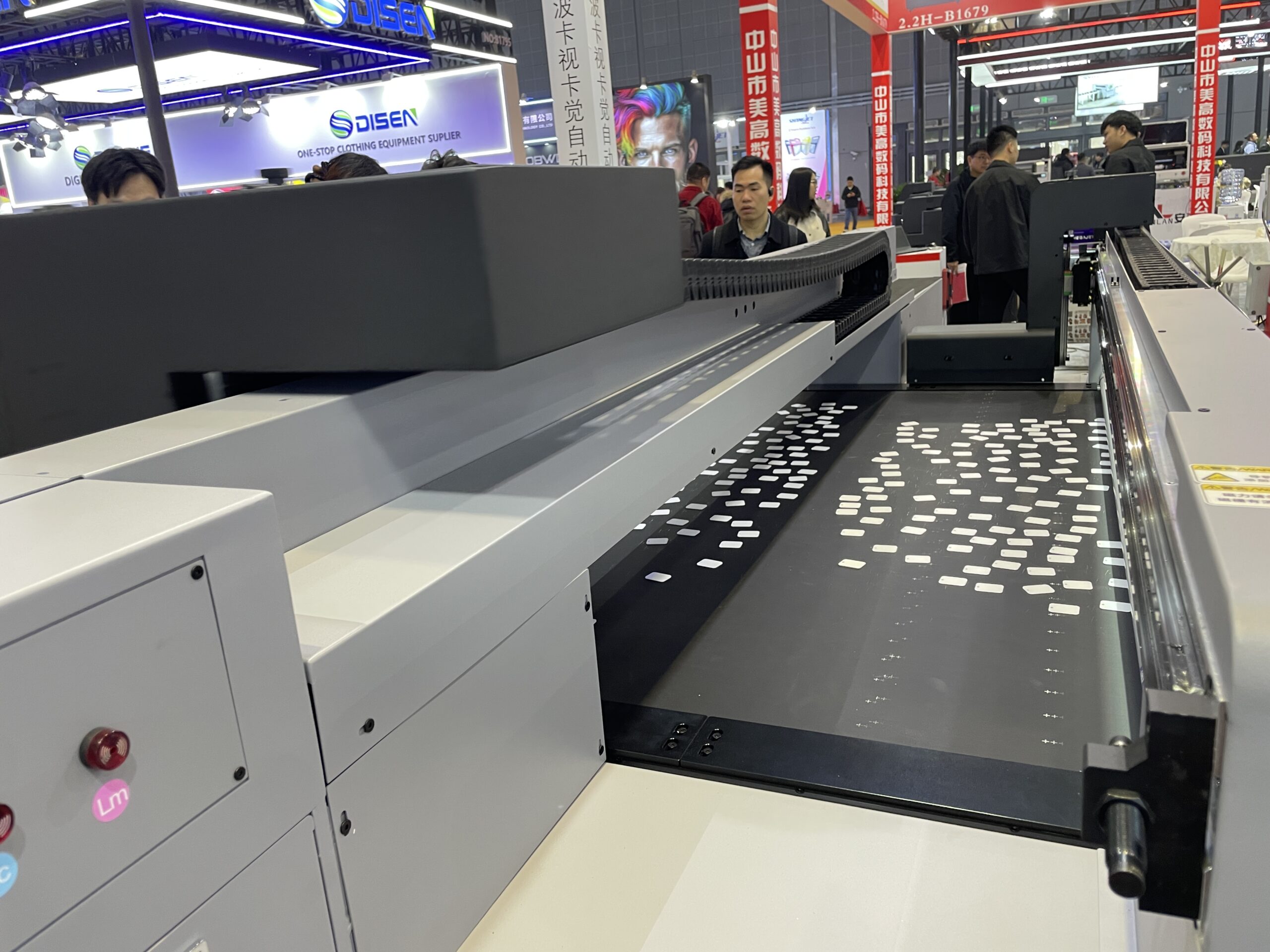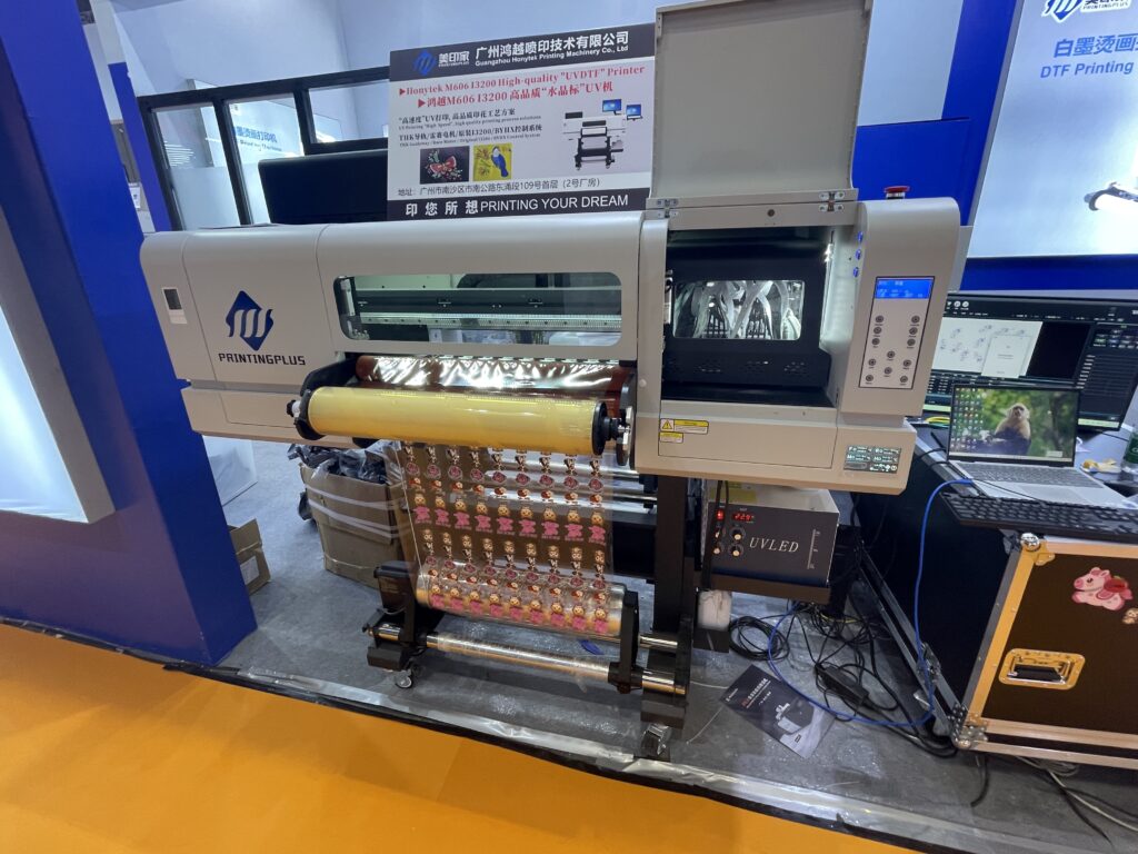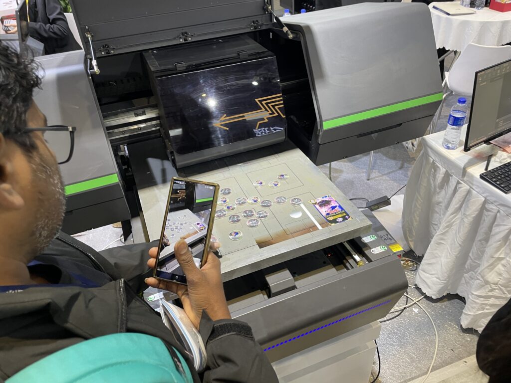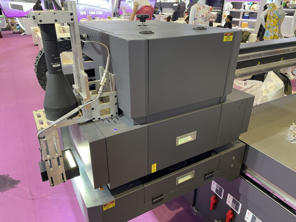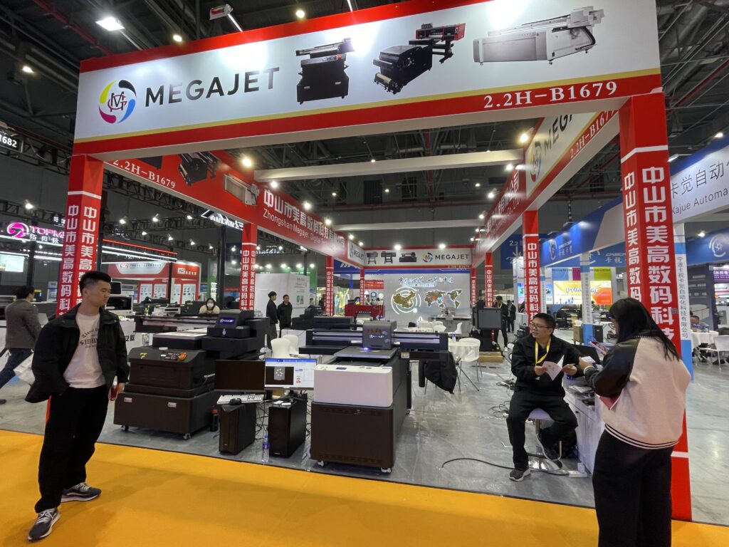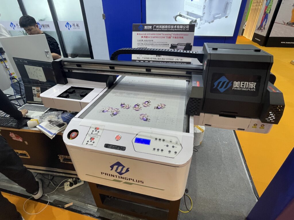 広州鴻越噴印技術(美印家)は2018年設立、広州市のデジタルプリント機器メーカー。UVフラットベッドプリンタやDTF、DTGなどを展開している。グッズ用のフラットベッドUVプリンタ「ACU6090」のデモでは、CCDカメラの自動位置合わせでアクリル素材へのプリントを行った。作業エリアは600×900mm、最大厚は10㎜。