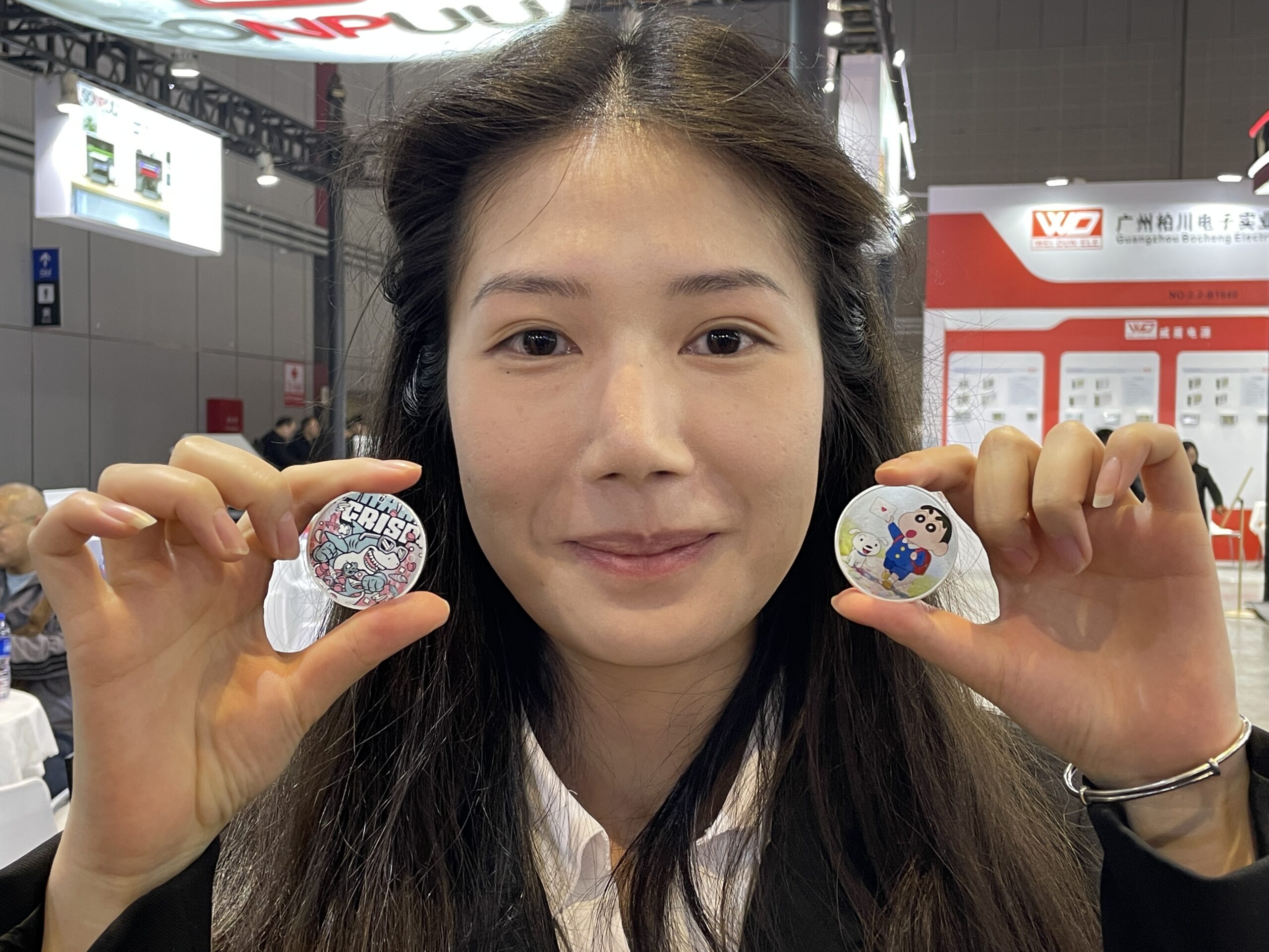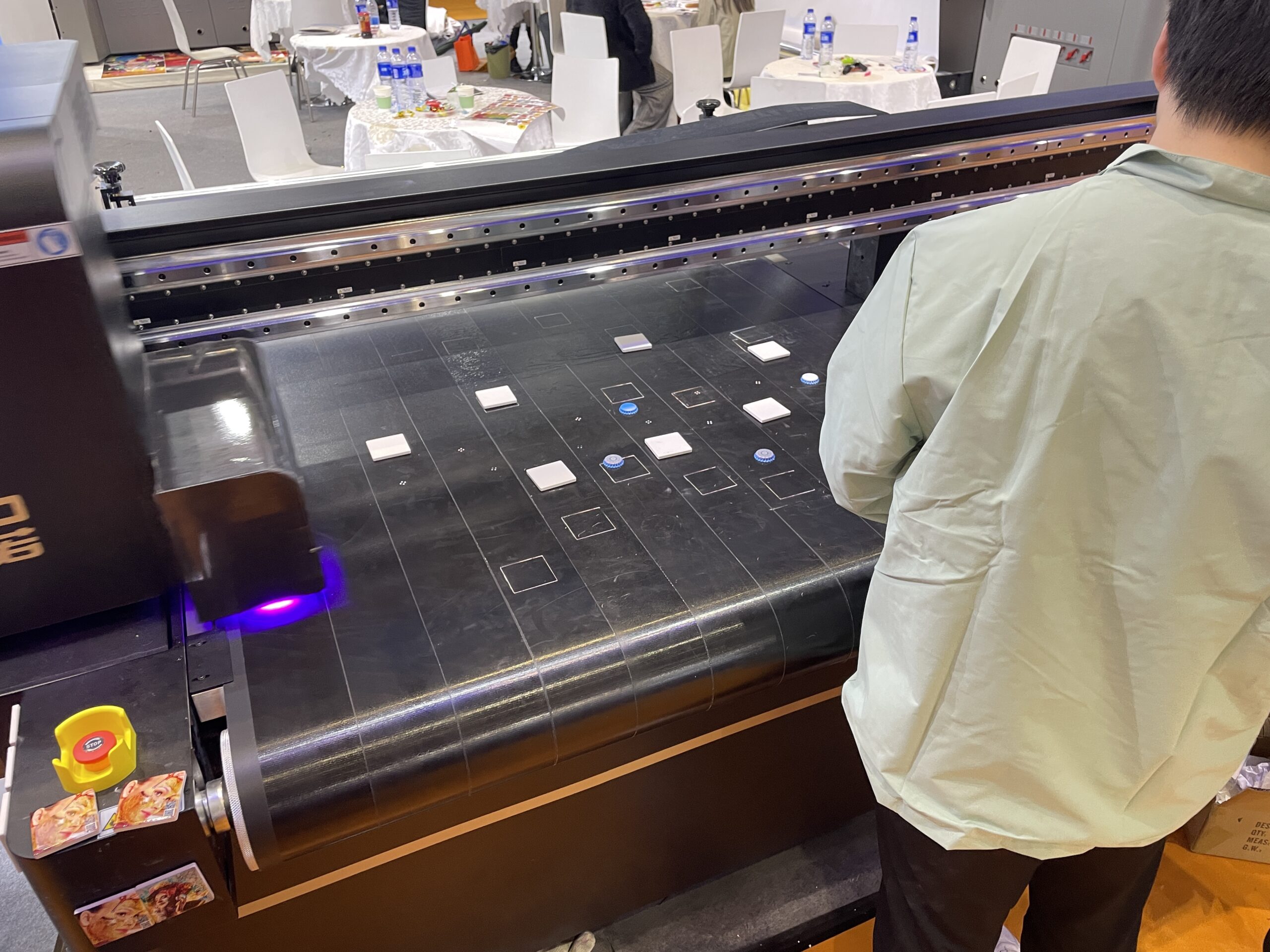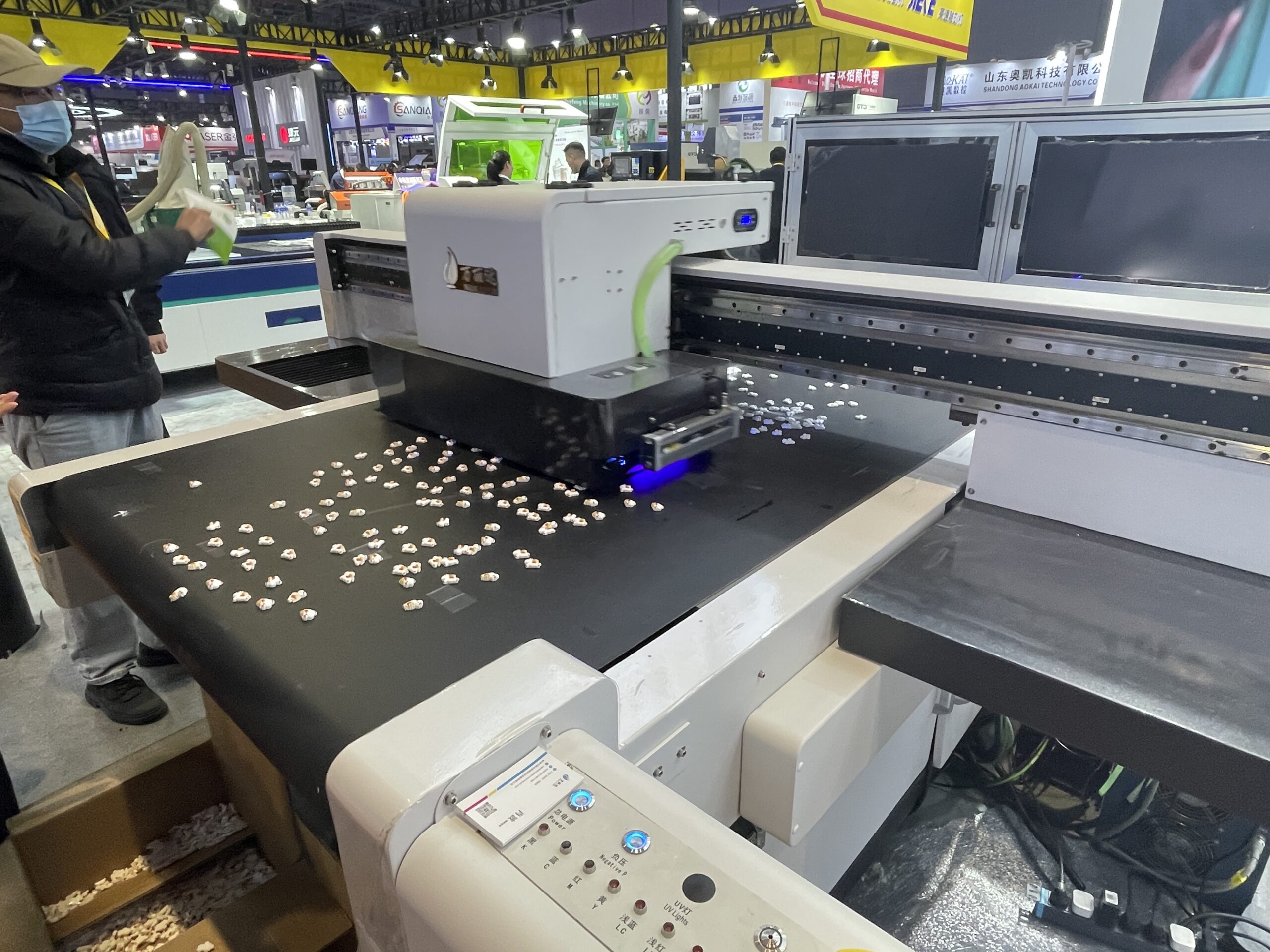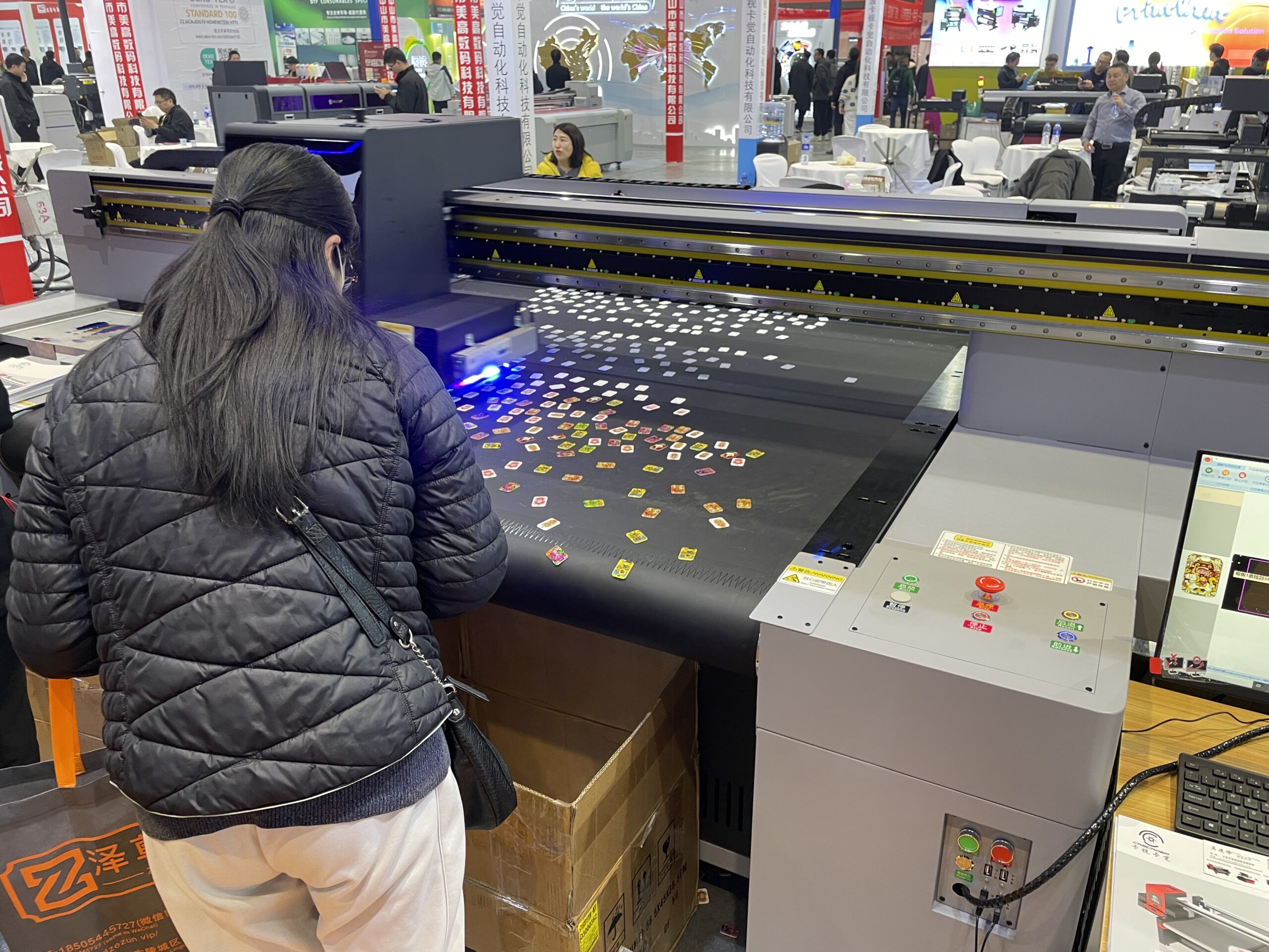 広州鴻越噴印技術(美印家)は2018年設立、広州市のデジタルプリント機器メーカー。UVフラットベッドプリンタやDTF、DTGなどを展開している。グッズ用のフラットベッドUVプリンタ「ACU6090」のデモでは、CCDカメラの自動位置合わせでアクリル素材へのプリントを行った。作業エリアは600×900mm、最大厚は10㎜。