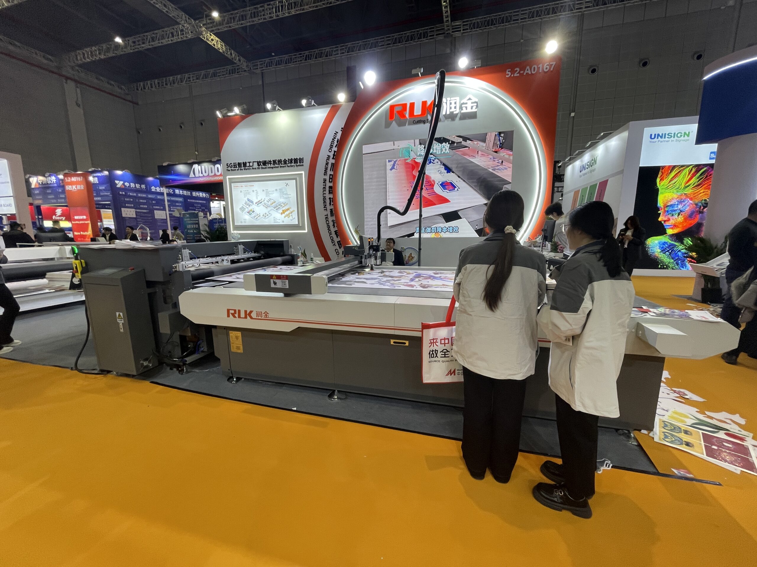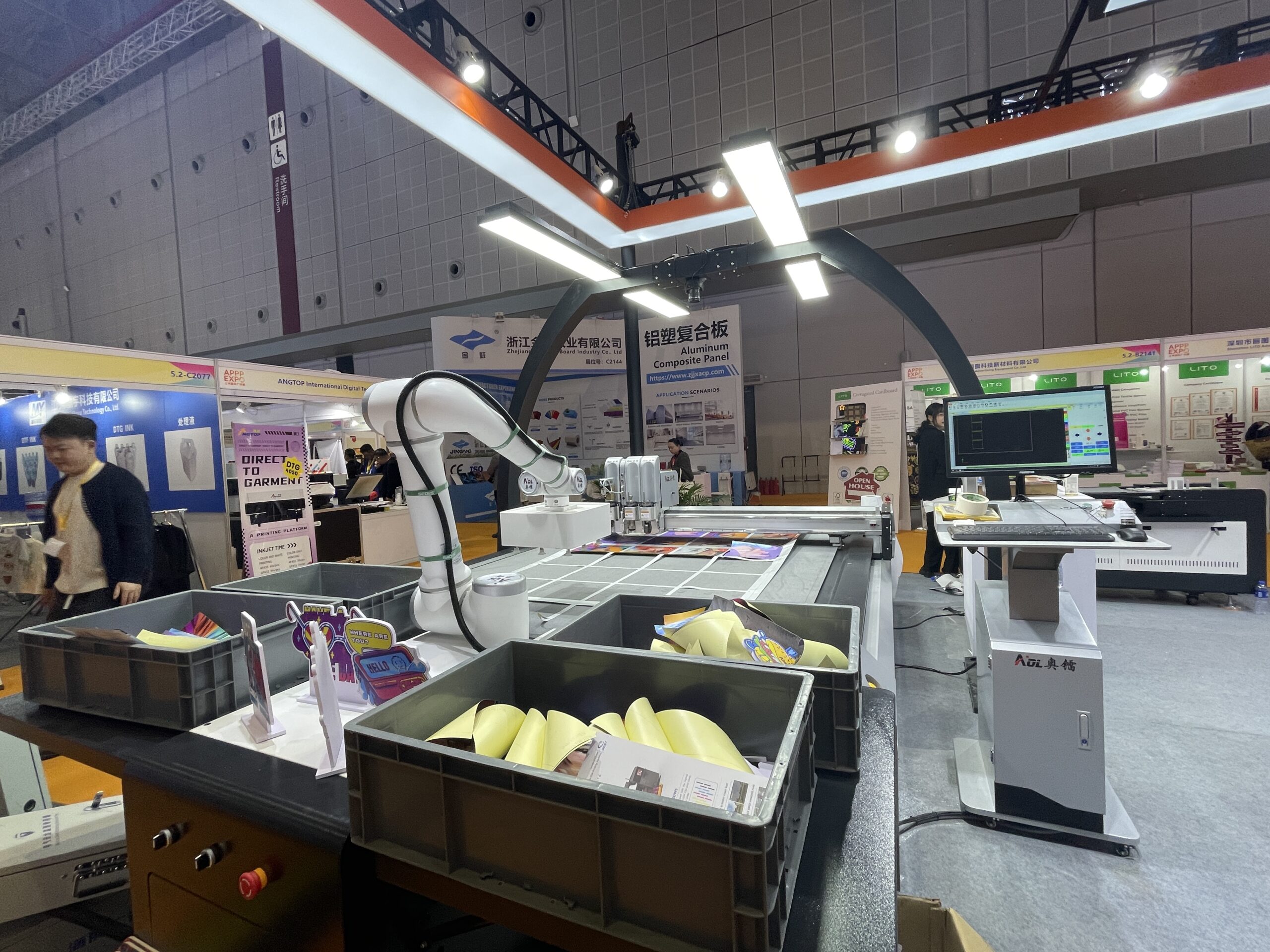 宇森科技の「YS-T600」は、同社のUV-DTFプリンターモデルで600㎜幅クラス。 奥儒の「AOL1625」もカメラ付きカッティングプロッター。カットはもちろん、メディアを大きさやデザインで見分けて、ロボットアームが箱に仕分けしていくデモンストレーションを行った。価格は2万7,000ドル。同社は2010年設立で累計8,000台。