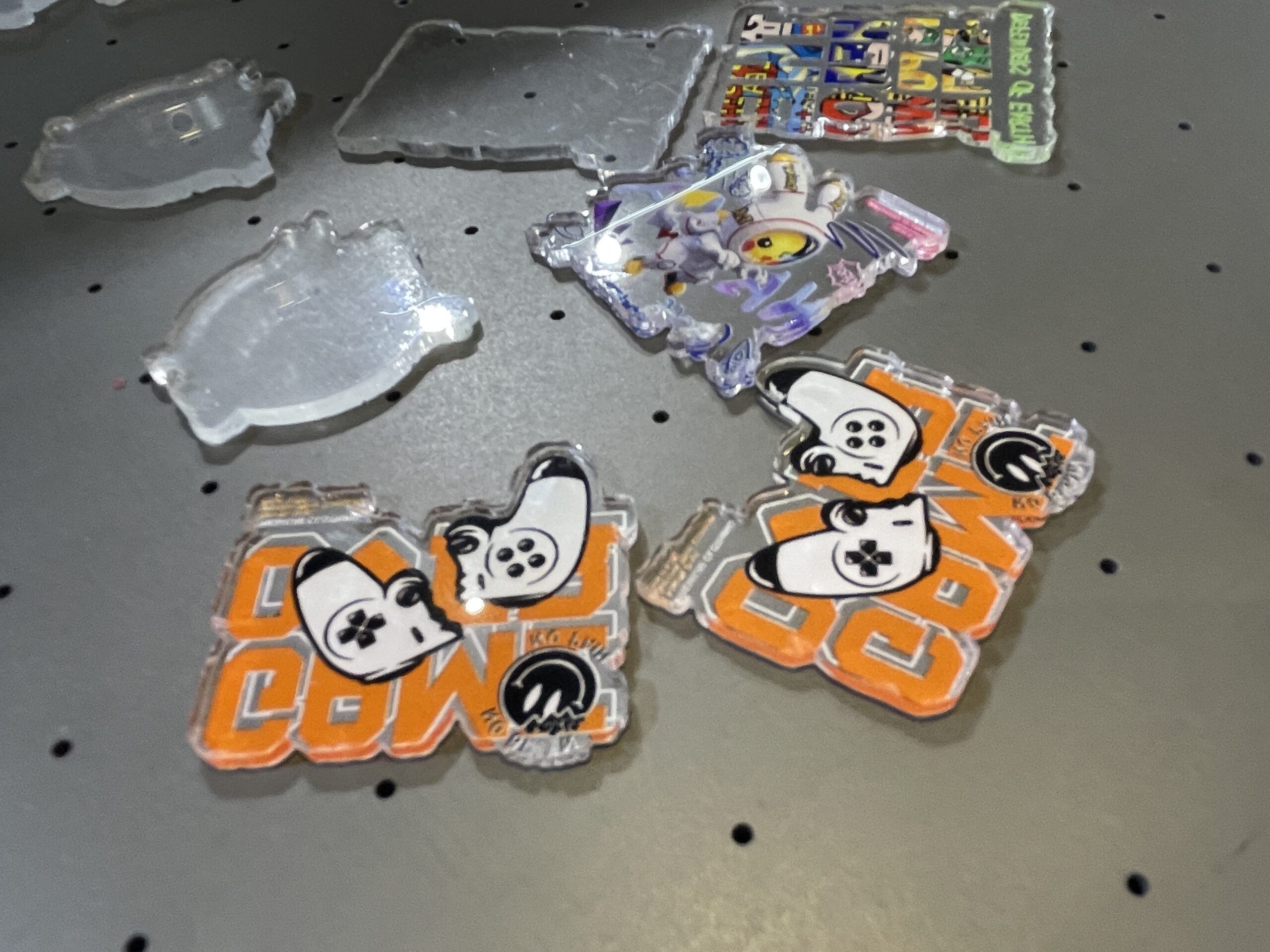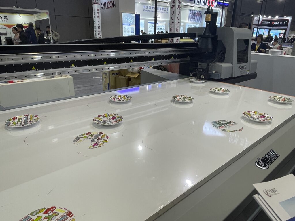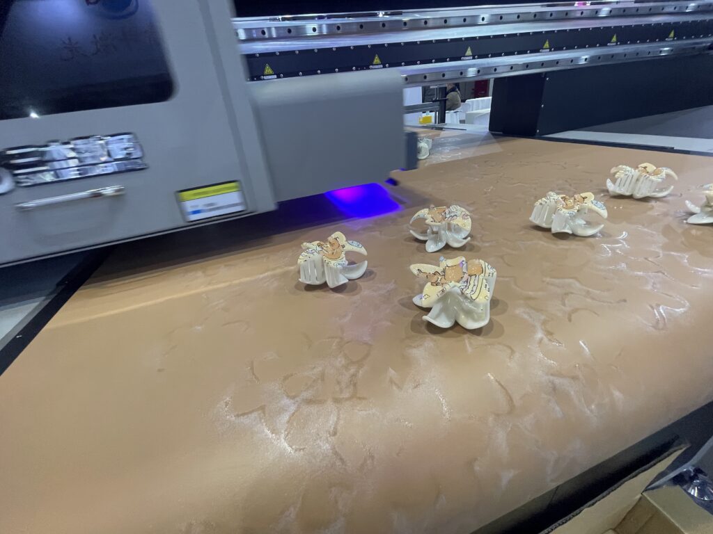 三傑数碼の「三傑2513」は、UVフラットベッドプリンタで2.5×1.3mの出力エリアをもつ。これも凹凸のプリントに強く、自動位置合わせをしながらプラスチックの皿へプリントした。 中型の「同1216」(出力エリア1.2✕1.6m)では、艾傑麗とおなじヘアクリップへのプリントを行った。 ヘッドはリコーのGen6。