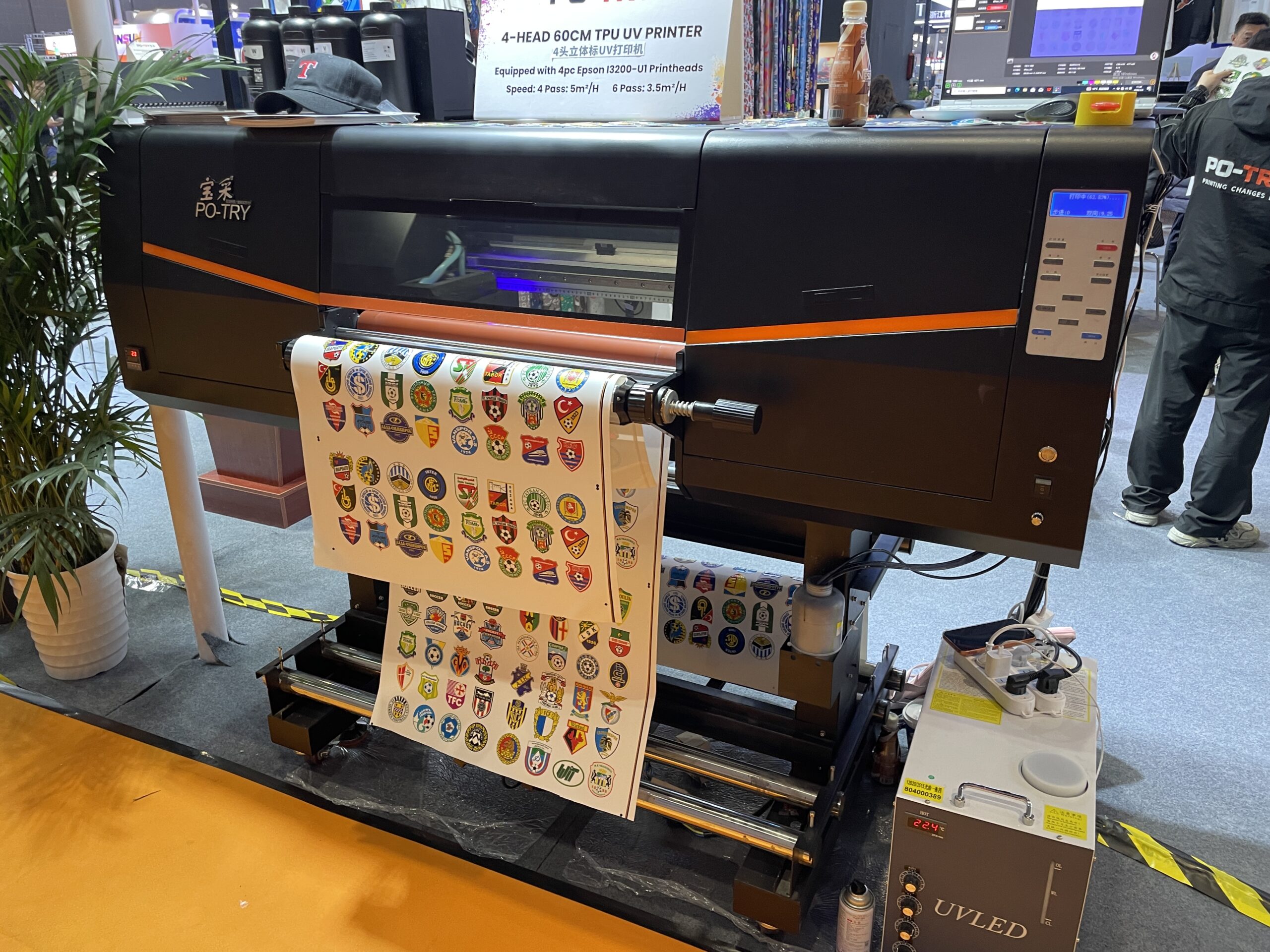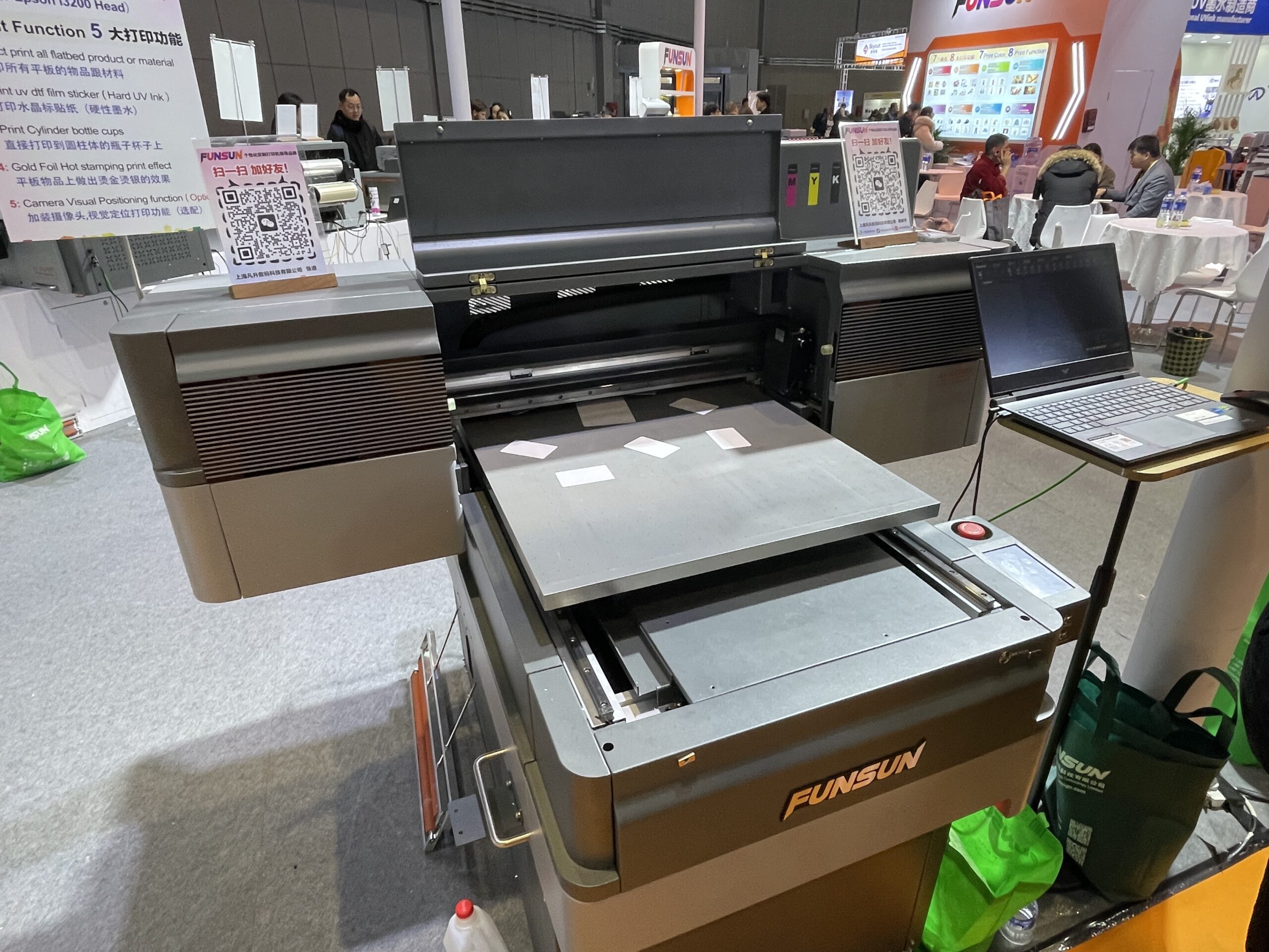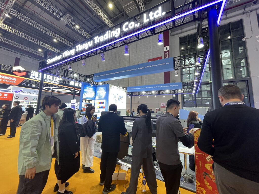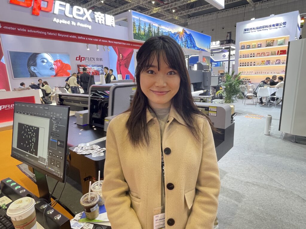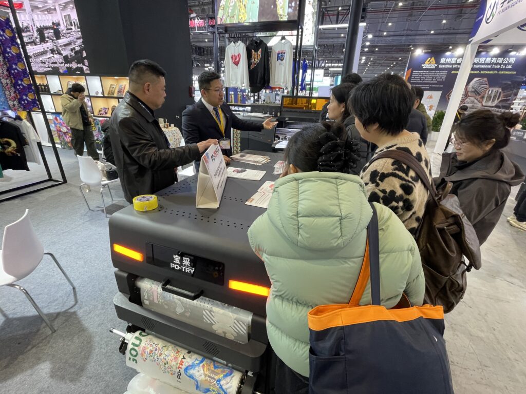 広東新泰智能科技は、宝彩(PO-TRY)ブランドでDTFやUV-DTFなどを紹介した。DTFは8ヘッド120cm プリンタがあり、昇華転写プリンタもラインアップしている。 FUNSANの「A1UV printer」は内蔵のセンサーで素材をスキャンしてからプリント可能。また、DTFフィルムのプリントもできる2ウェイタイプで、価格は1万1,000ドル。このほか、ボールペンをプリントするデモも行った。同社は17年の実績があり、全社で年間500台を販売している。