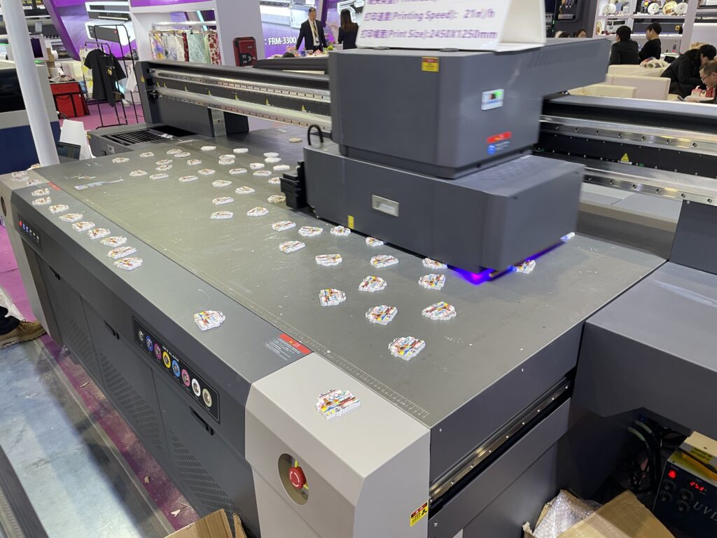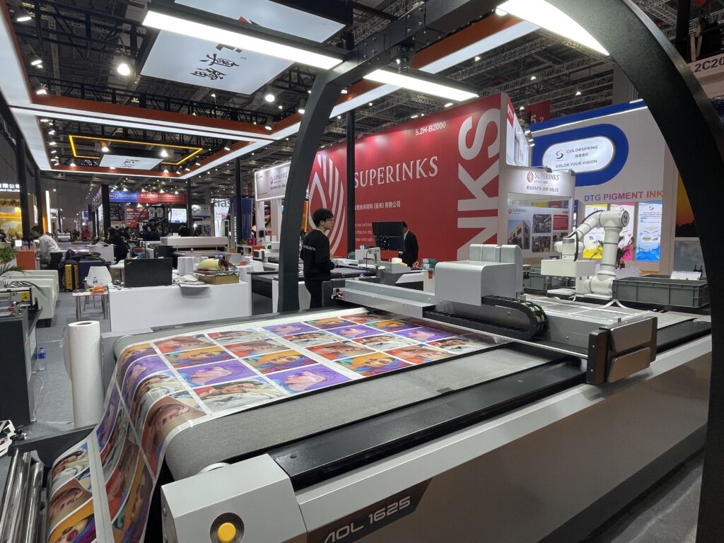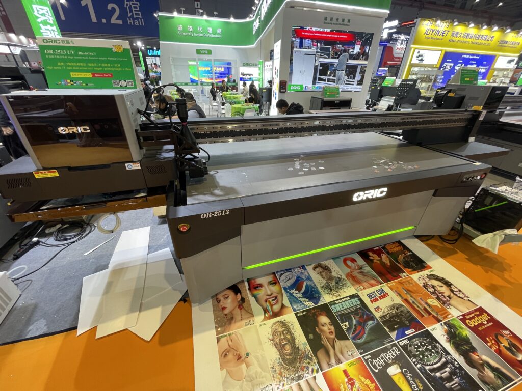 欧端卡ORICの「OR-2513」は大判のUVフラットベッドプリンタで2.5✕1.3mサイズに出力できる。こちらもCCDカメラをヘッドの脇につけており、アクリル素材を読み取り位置合わせ不要でプリントできる。担当者に「この大きなサイズでグッズプリントをするのか?」と聞いたところ、「多くの会社がこの方式でグッズをプリントしている。作業エリアが大きい方が数多くのプリントができるのは当たり前のこと」と答えてくれた。販売先はインドや南アジア、ロシアなど。このほか、昇華転写プリンタも出品していた。