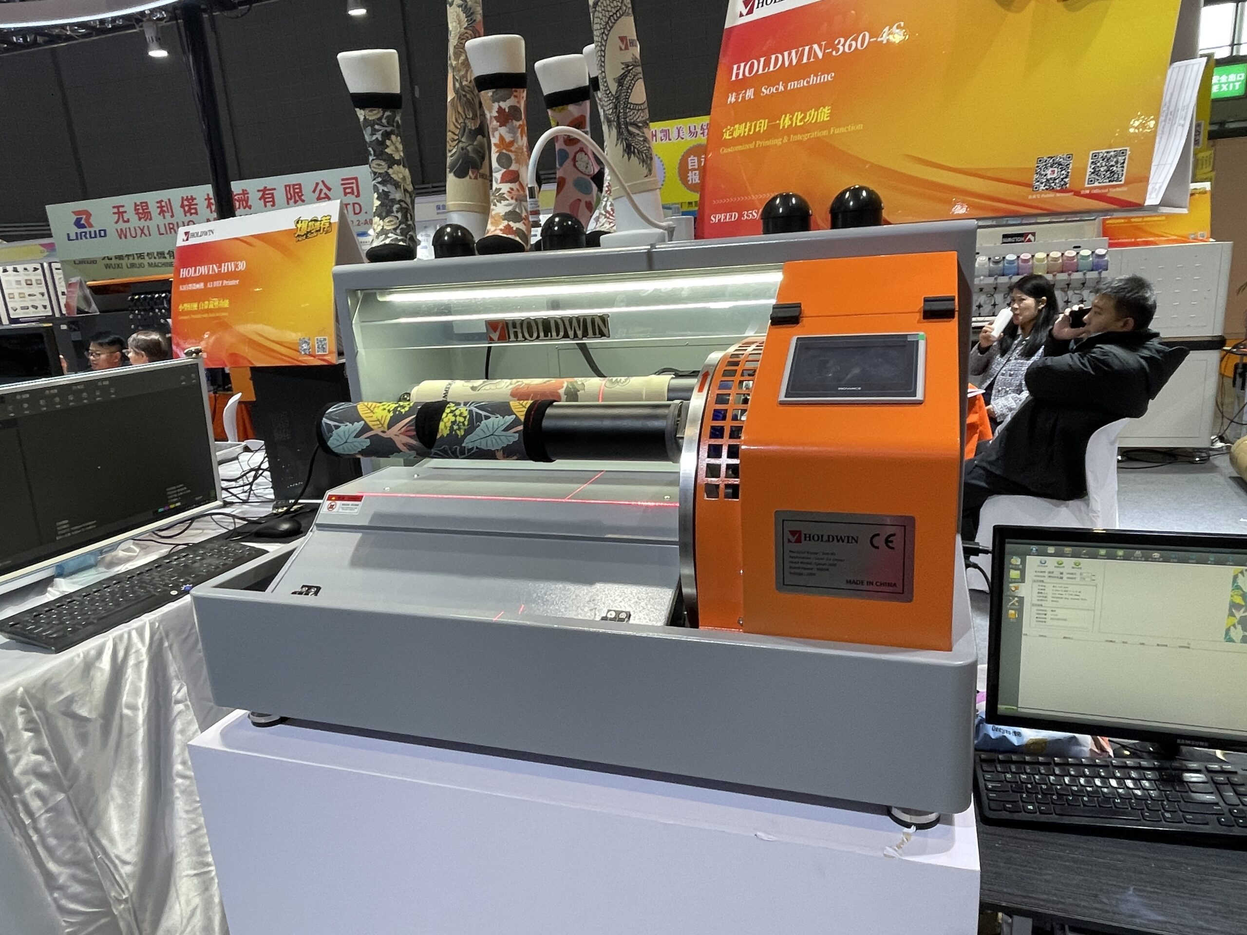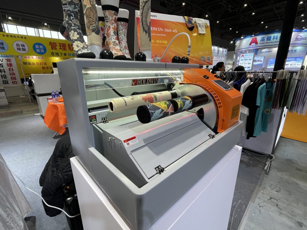 ユニークだったのはHOLDWINの「HOLDWIN-360-4S」。同機は360°回転DTGプリンタで、靴下やレッグウォーマー、袖など円筒状生地への全周プリントに特化している。ピグマットインクという特殊なインクを採用しており、靴下を約1分でプリントできる。価格は約8〜15万元。