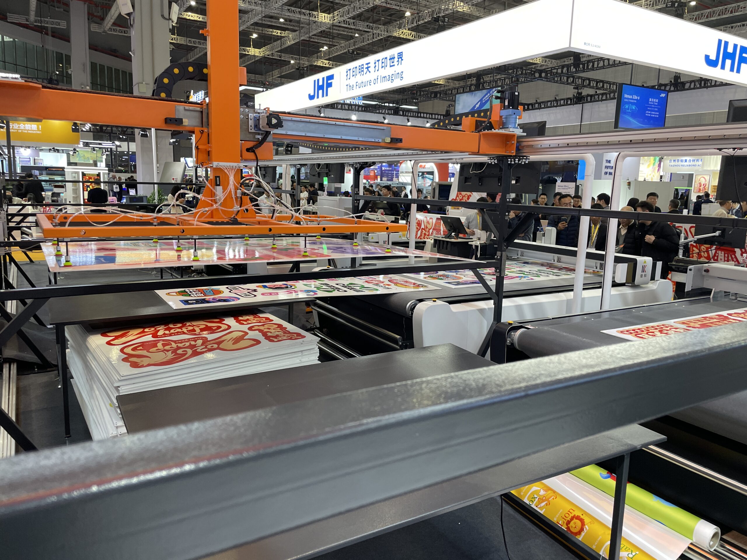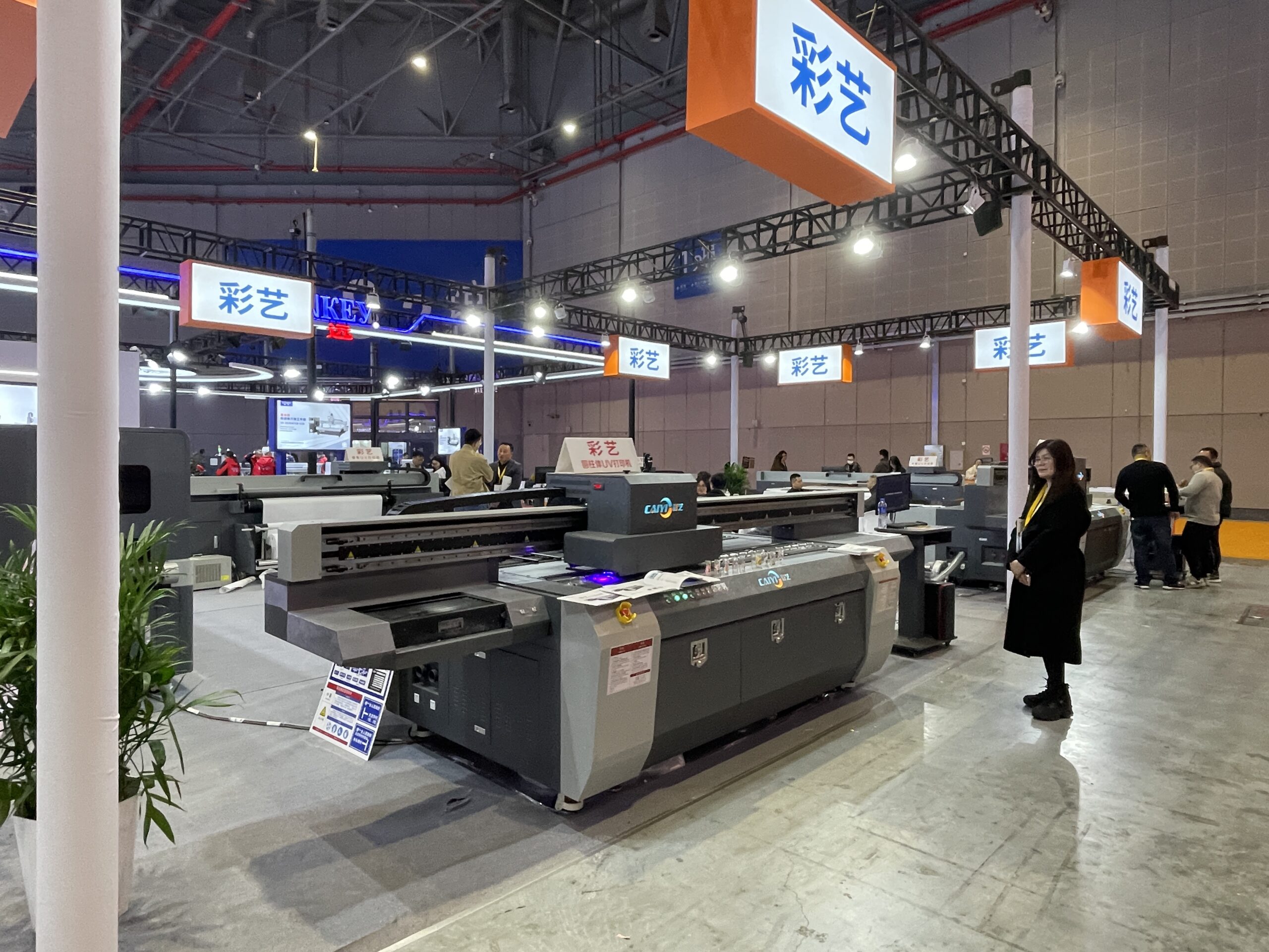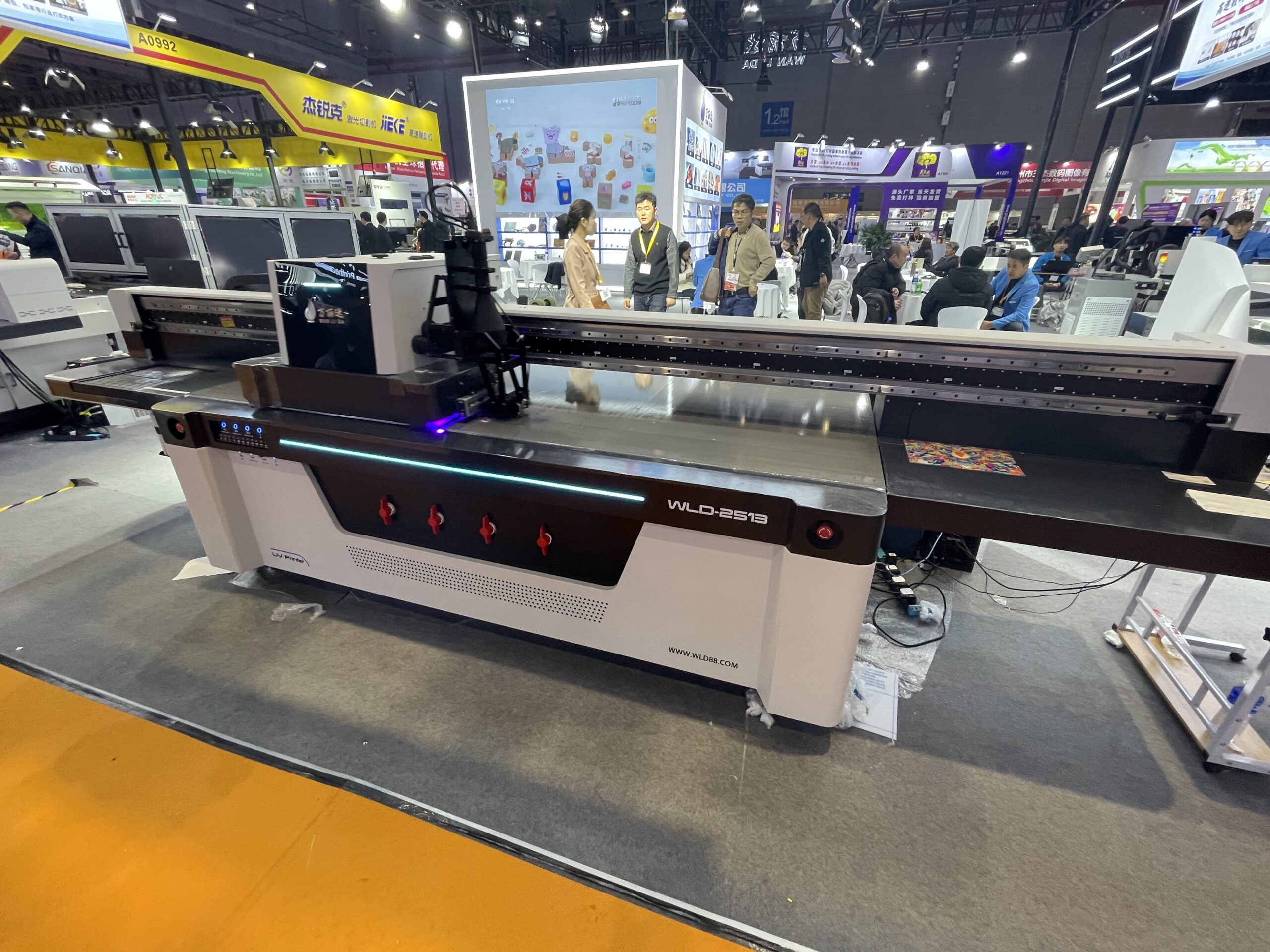 万丽达(WANLIDA)は安徽省プリンタメーカーで、2009年頃からUVデジタルプリンタの製造に注力し「WLD」シリーズが主力。「WLD-2513」は大型UVフラットベッドプリンタの定番モデルで、出力エリアは2.5×1.3m。「WLD-LV1220」は出力エリア1.2×2.0m。いずれもCCDカメラ付きで、読み取りから出力、排出までを自動化して見せていた。