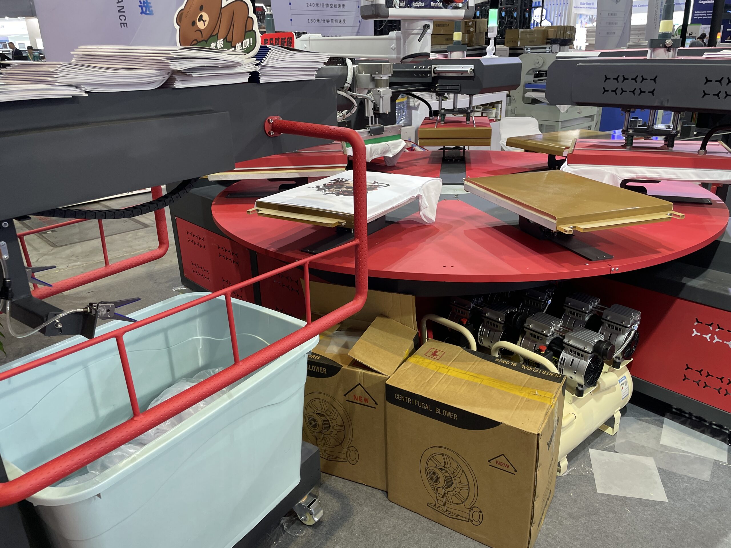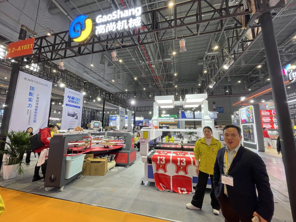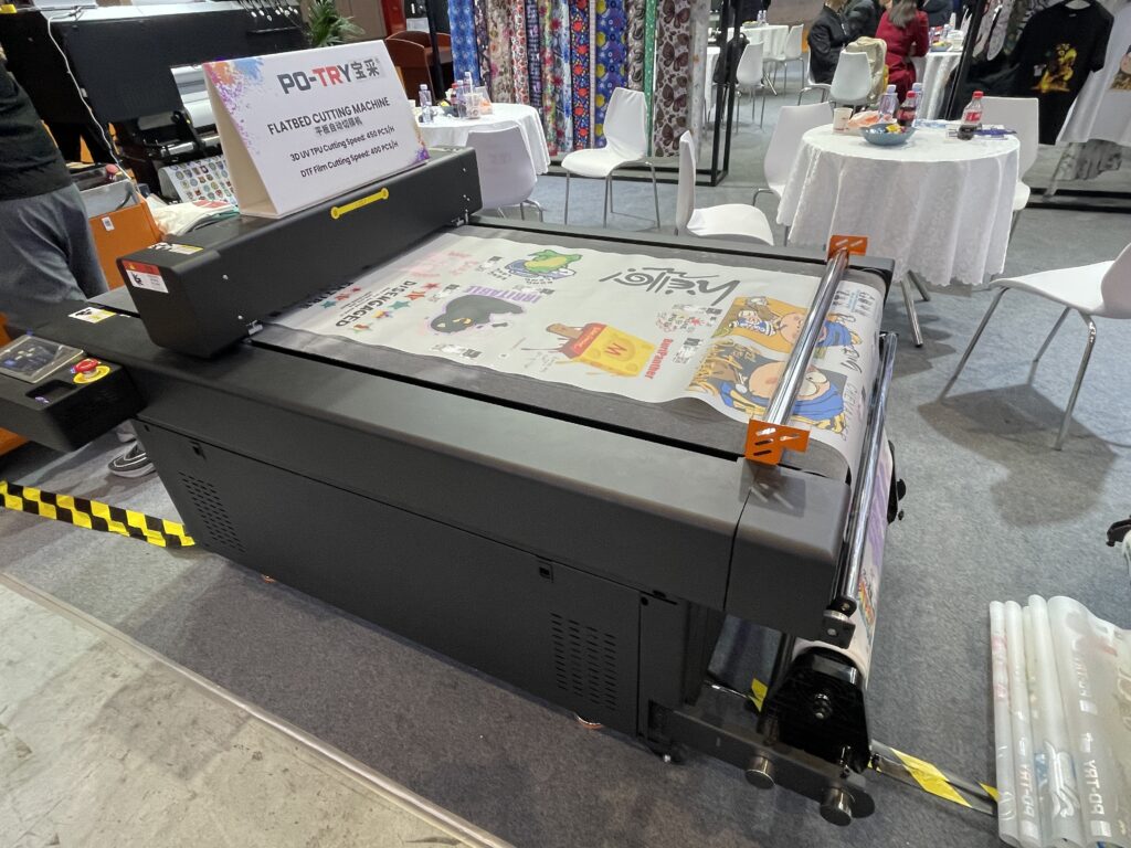 高尚機械は、東莞市のプリンティング向けデジタル機器メーカー。PDF用のオーバルタイププレス機を展示。プラテン7台で、フィルムから布地への転写を効率的に行えるという。2のプラテンを用いて交互にプレスするタイプもあった。またカメラ付きのカッティングプロッターも紹介しており、こちらは1万8,500ドル。