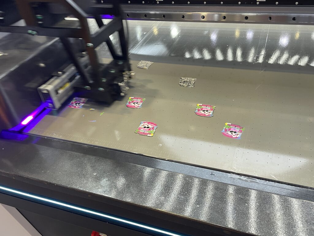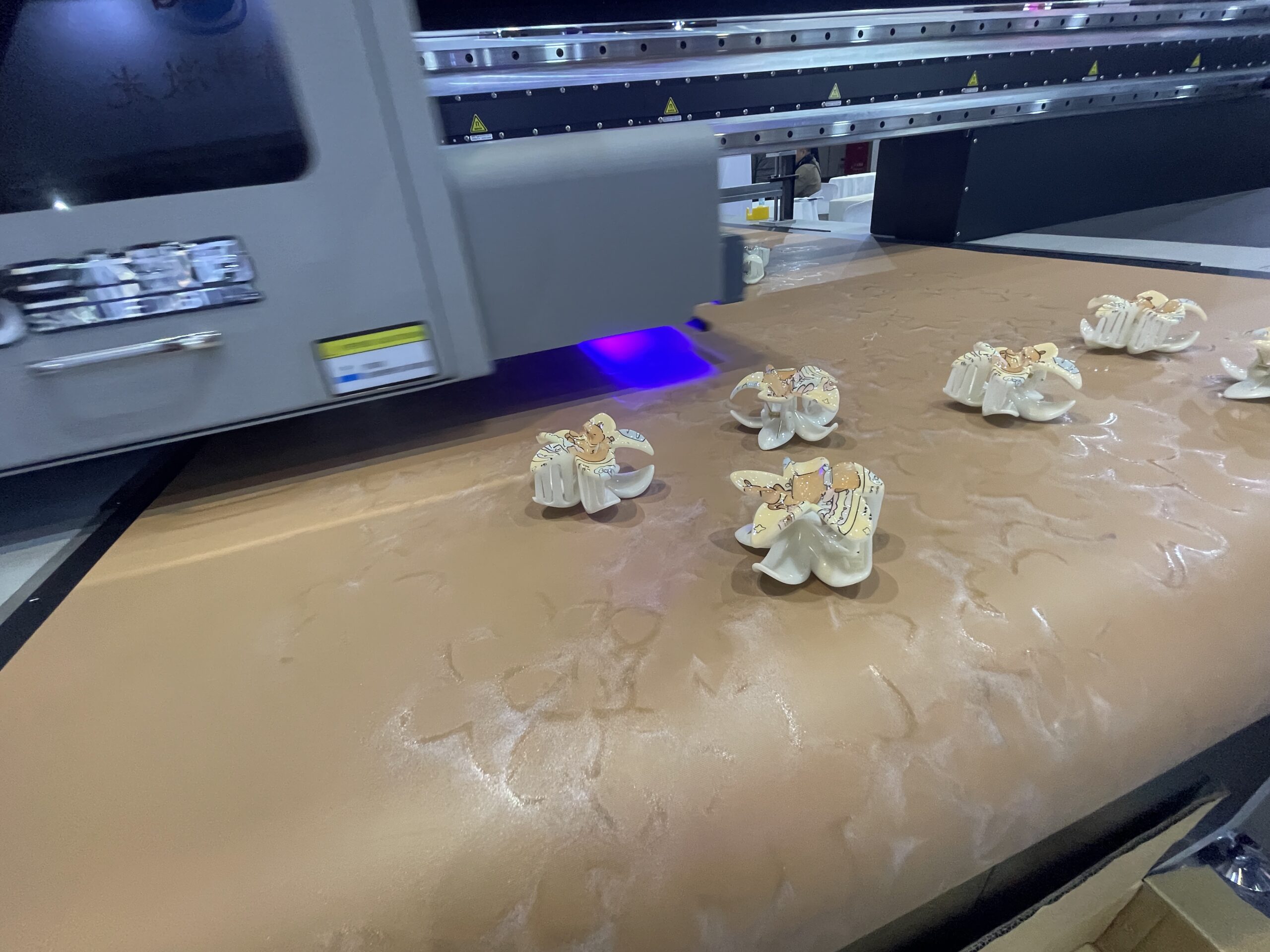 また「EF2516-R6」はEFシリーズの派生/上位モデルで、2516は出力エリアが2.5×1.6m)、リコーGen6ヘッドを搭載している。オプションでCCDカメラを搭載可能で、自動位置合わせに対応する。最大厚150㎜まで対応している上、凹凸や曲面のある素材へもプリントできる。デモではカメラを搭載して花びらのような複雑な形のヘアクリップへ出力していた。技術的にも日本ではなかなか見られないもので、来場者の多くが足を止めサンプルを手に取った。