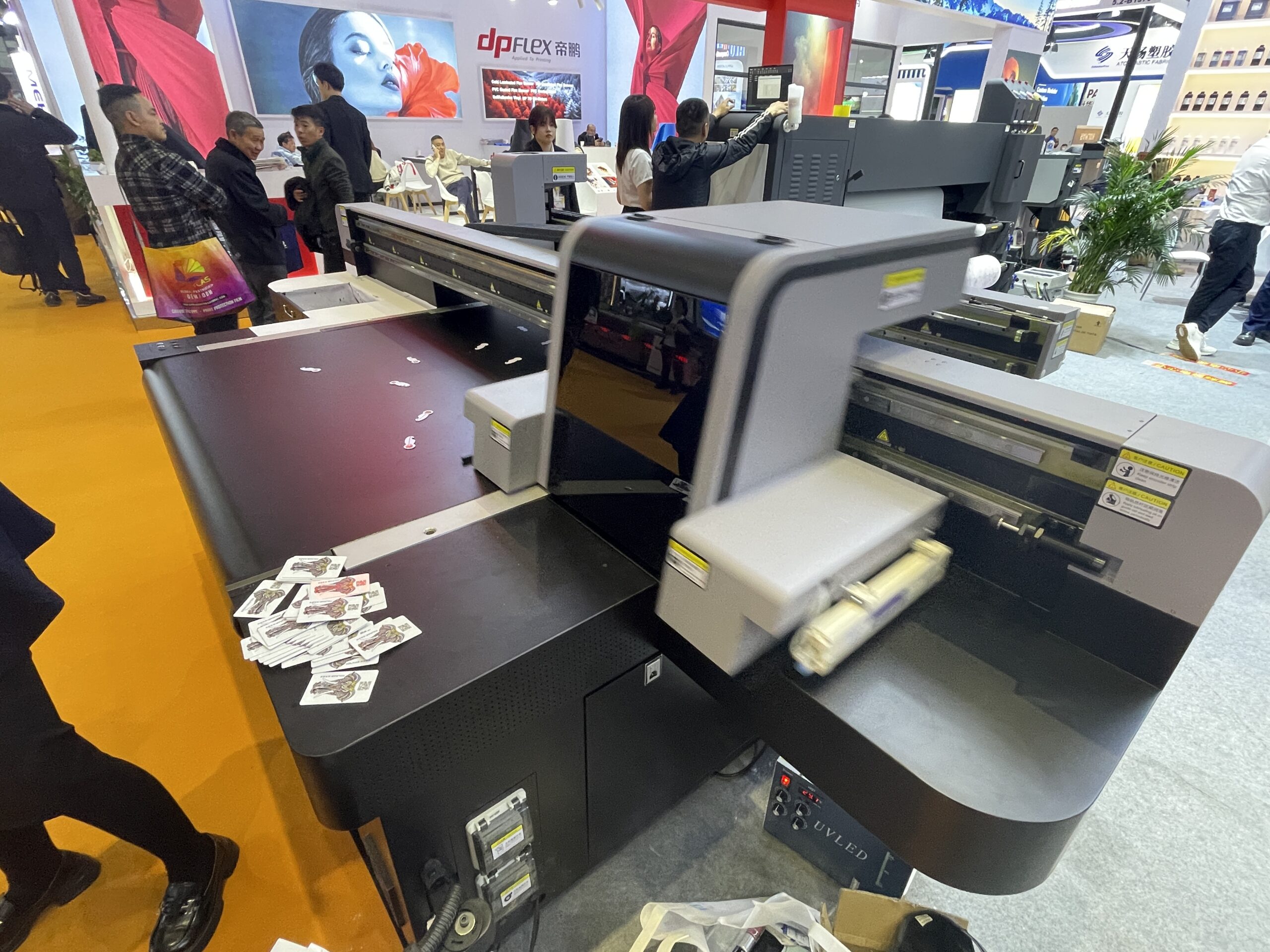 帝鵬(Dlican)の「DP FLEX」はUVプリンタのブランド・シリーズ。今回は「DLI-1319s」は画像位置決め機能付きのプリンタ。CCDカメラを標準搭載しており、不作為に置かれた素材の形やデザインを読み取ってプリントでき、治具なども必要がない。出力サイズは1.3× 1.9mで、高速モードで約90m²/h以上の生産性がある。ヘッドはリコーの「Gen6」を搭載しており、価格は3万7,500ドル。