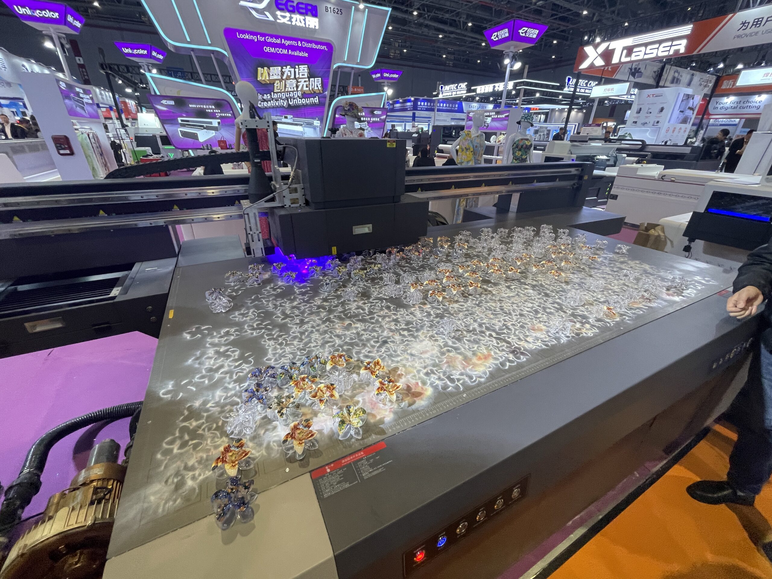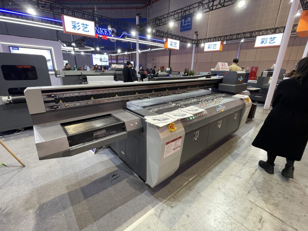 艾傑麗(EGERI)は、広州市を拠点とするUVフラットベッドプリンタメーカー。「E2513」は大型UVフラットベッドプリンタの定番モデルで、出力エリアは2.5×1.3m。