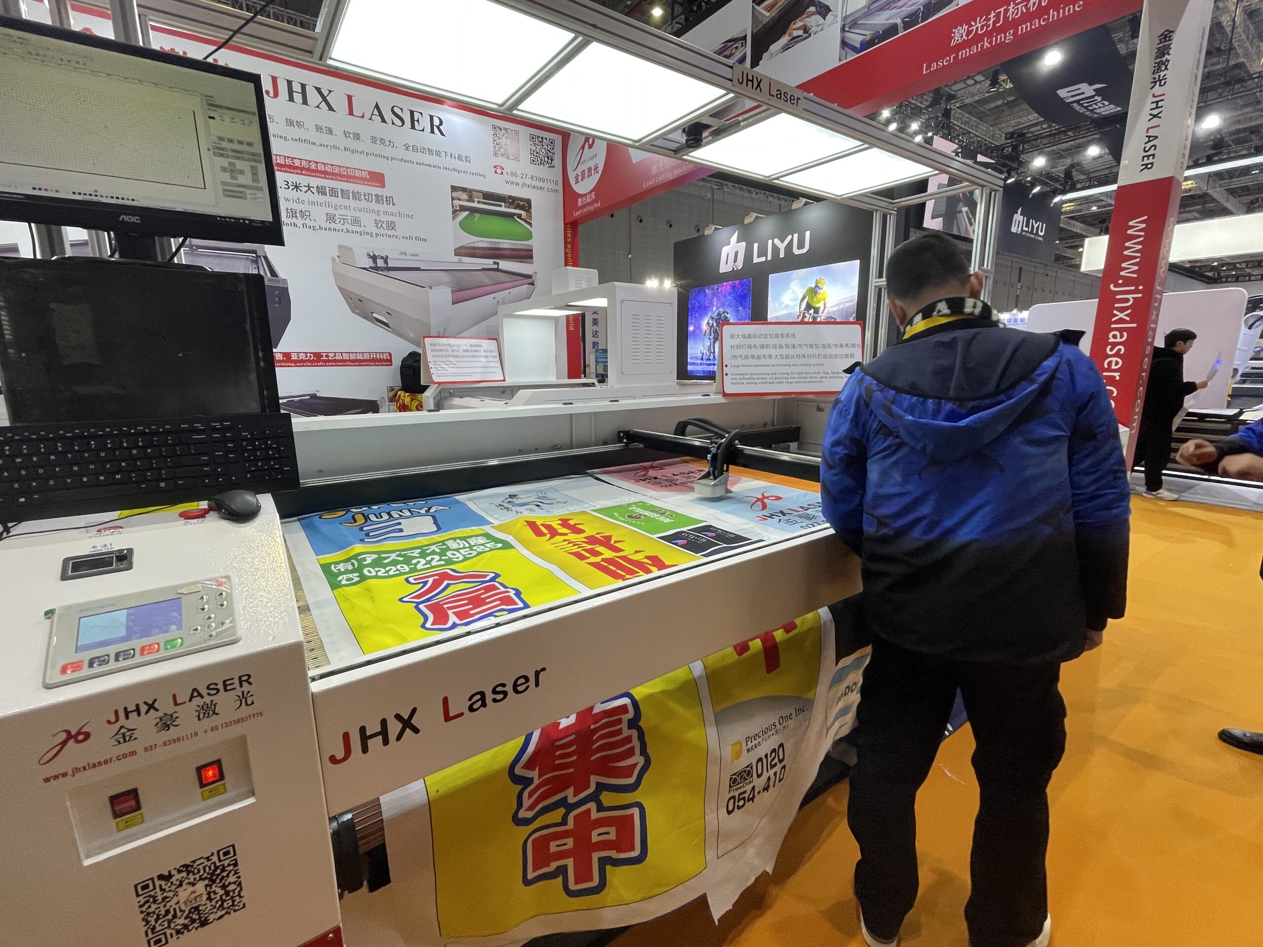 咔啉激光は「KASU laser」のブランドで、レーザー加工機を販売している。「KD1830-SY-G」は、最大加工サイズが1800×3000㎜で搬送装置付き、CCDカメラでデザインを読み取りながらカットした。価格は2万ドルで、日本にもユーザーがおり、のぼりの加工に使われているという。