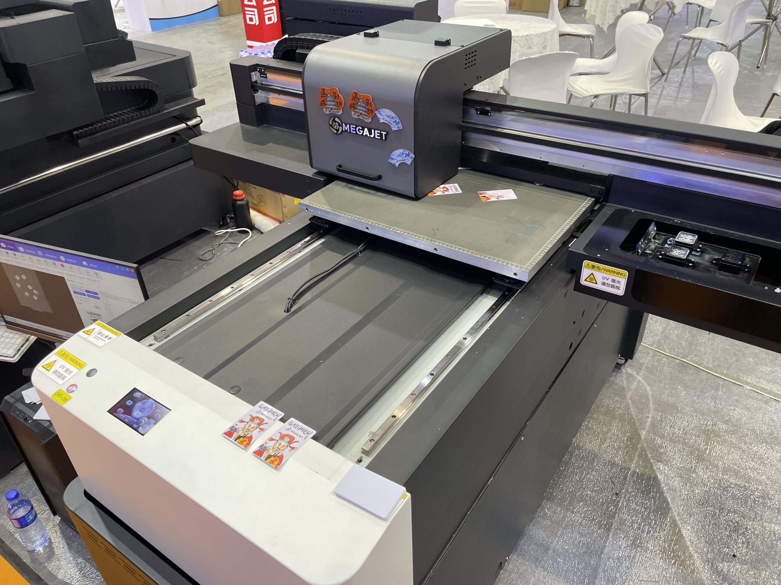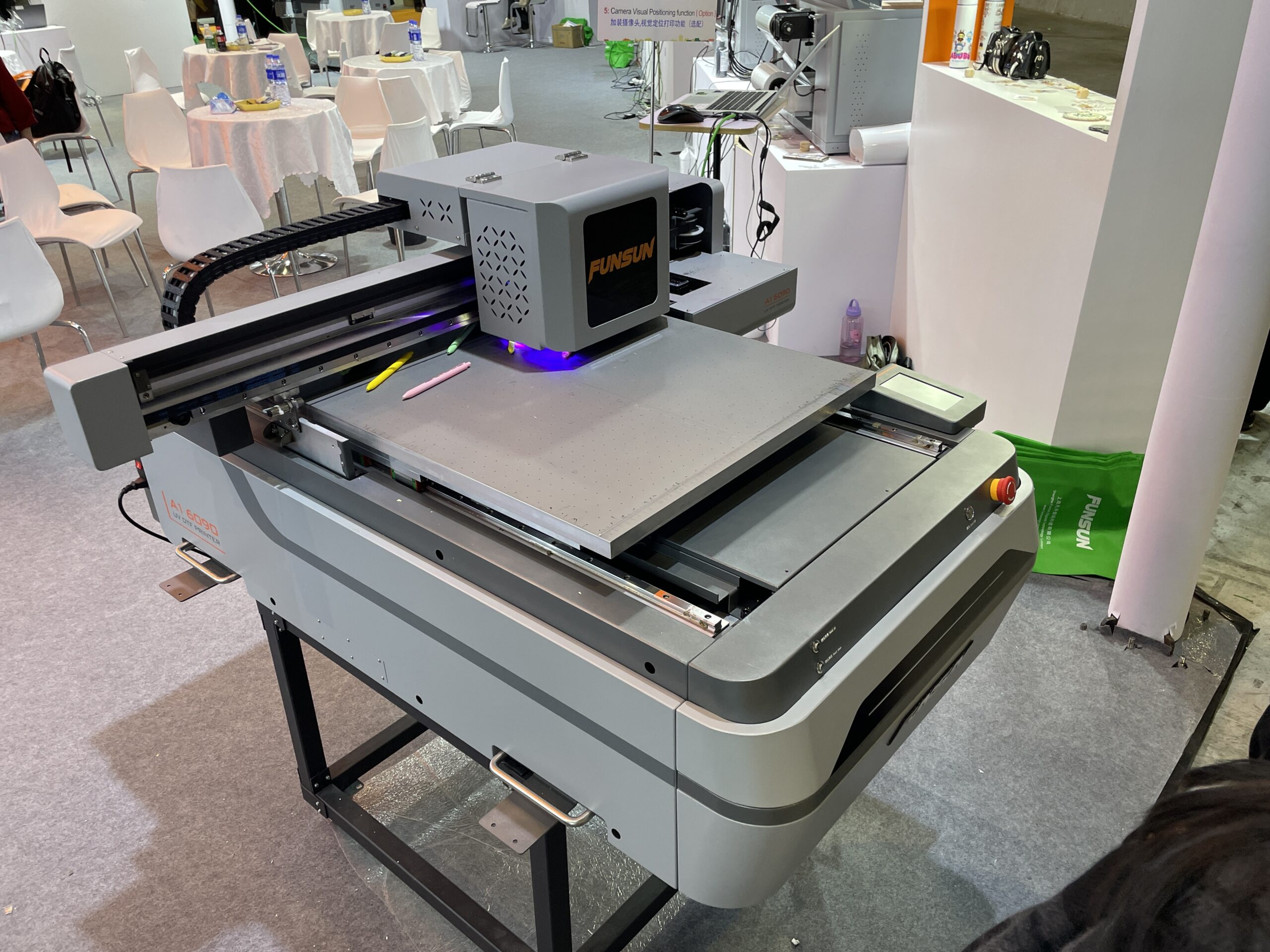 美高数碼科技の「MEGA JET6090」もカメラ付きで自動位置合わせの卓上UVプリンタ。最大600×900㎜サイズのプリントができ、価格は4,100ドル。
