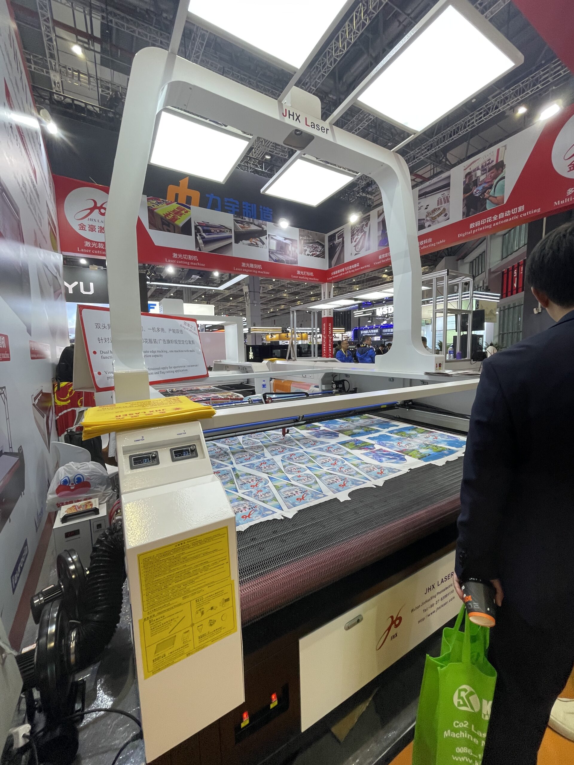 金豪激光(JHX Laser)は2010年設立のレーザー機器専門メーカー。激光はレーザーを表す中国語でレーザーメーカーの多くが社名にこれを入れている。「JHX laser 16010−S」は、大型フラットベッドCO₂レーザーカッティングマシンの主力モデル。1600×1000mmの加工エリアを持つマルチヘッド(オプションで2〜6ヘッド)の大型機で、アパレル・靴・バッグ・ソフトサイン・インテリアファブリックの大量裁断などで活用されている。