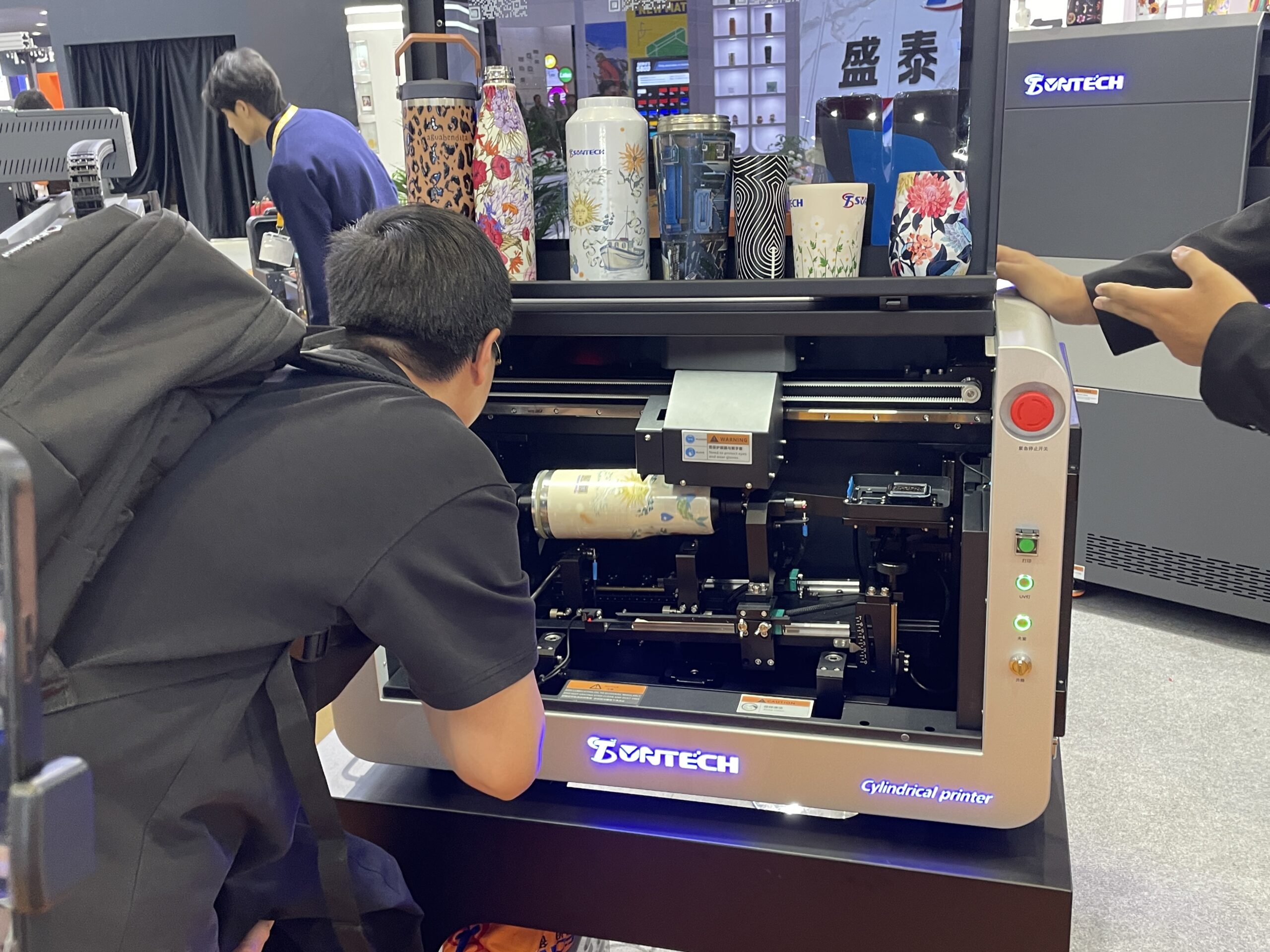 SUNTECHは円筒UVプリンタシリーズが主力。UVプリンタ「Cylindrical printer」シリーズは、ボトルや缶、カップ、タンブラーなどの円筒形や円錐形、不規則形状などへ360度全面プリントできる。 デスクトップ小型モデルから産業級高速機までラインナップがあり、Toshiba CF3やRicoh/Konicaヘッド採用で高精細・高速を実現している。