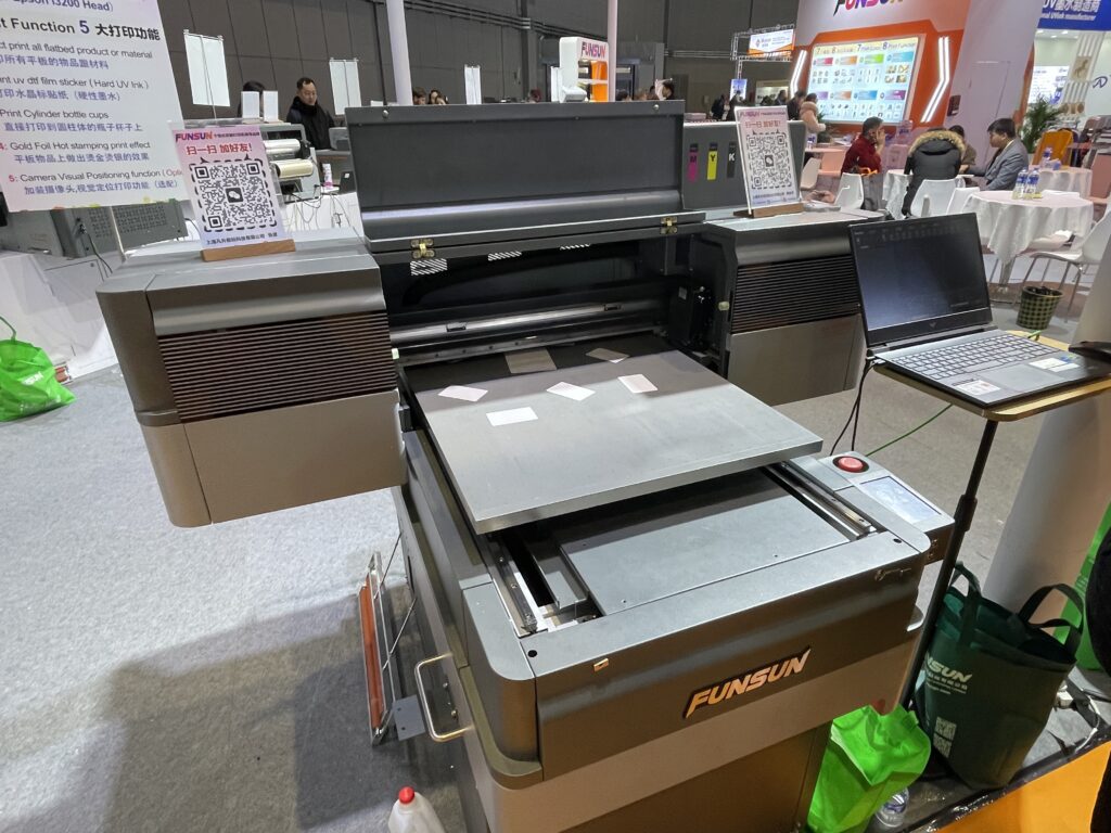 FUNSANの「A1UV printer」は内蔵のセンサーで素材をスキャンしてからプリント可能。また、DTFフィルムのプリントもできる2ウェイタイプ。このほか、ボールペンをプリントするデモも行った。価格は1万1,000ドル。同社ではすべてのシリーズを合わせて年間500台の販売数があるという。