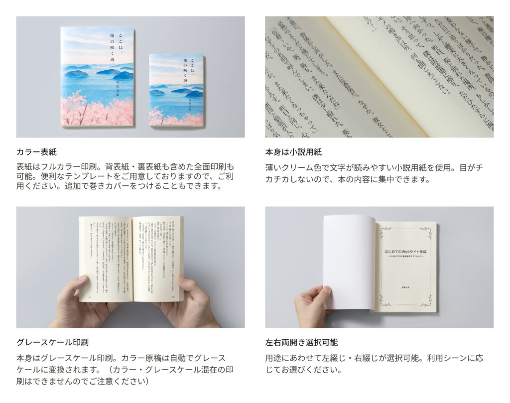 同サービスでは、これまで写真集や漫画、イラスト集の印刷に対応していたが、今回の機能拡張により小説や文集、技術書といった作品制作にも対応した。小説専用の用紙を採用し、表紙を自動生成できる「かんたん表紙作成」機能を新たに搭載。タイトルや著者名を入力するだけでデザインが完成し、装丁の知識がなくても本格的な一冊を仕上げることができる。価格は1冊396円(税込)から。