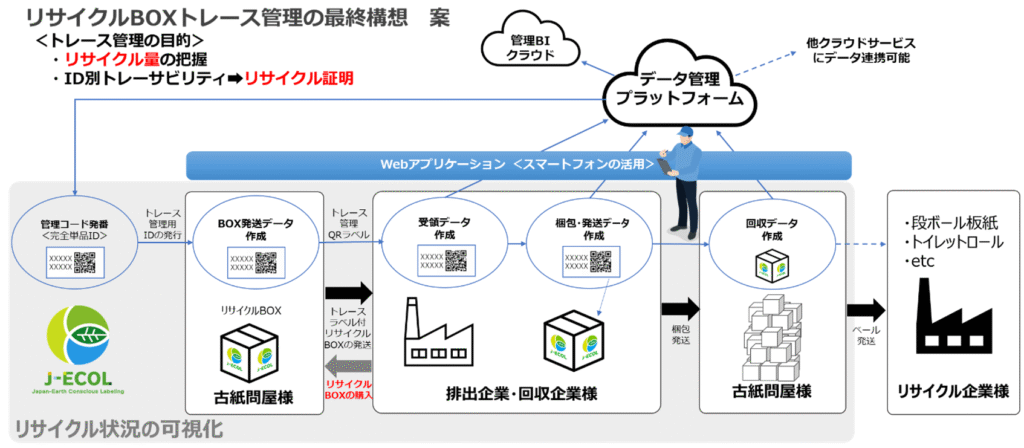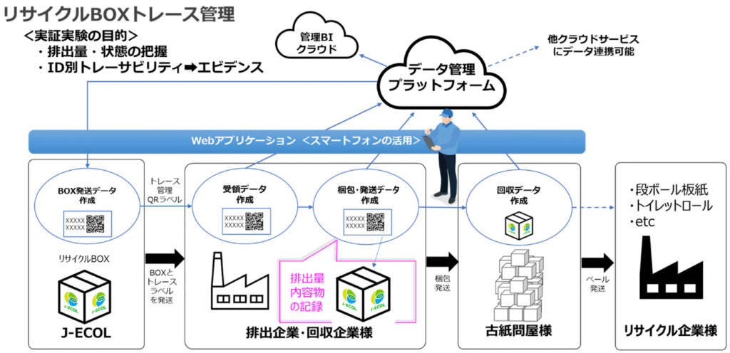 実証実験では、参加企業に設置するリサイクルBOXに個別IDを付与し、排出量や回収ルートをデータ管理する。また、トレース用ラベルには離解可能粘着紙を使用。古紙の離解処理時に粘着剤が水分散して非粘着化する素材を採用し、従来リサイクルを妨げていた粘着剤問題にも対応する。